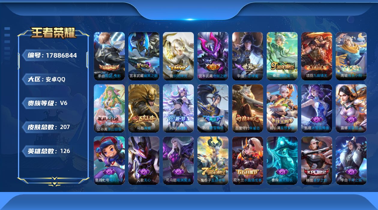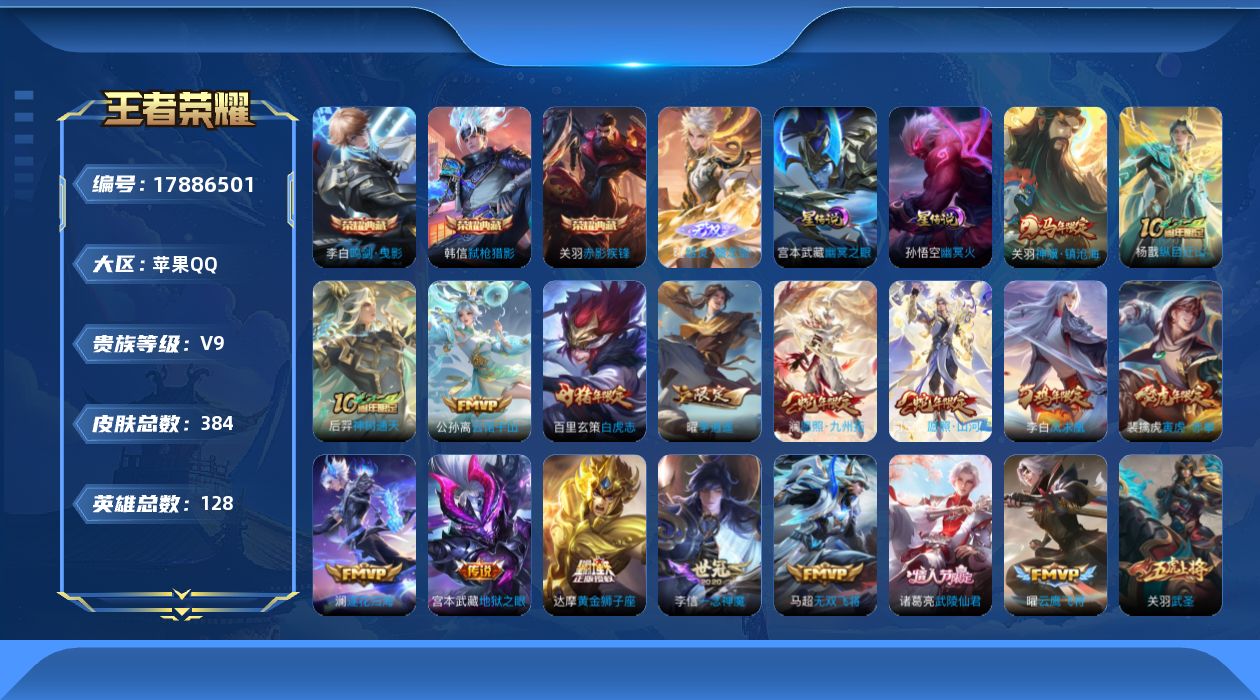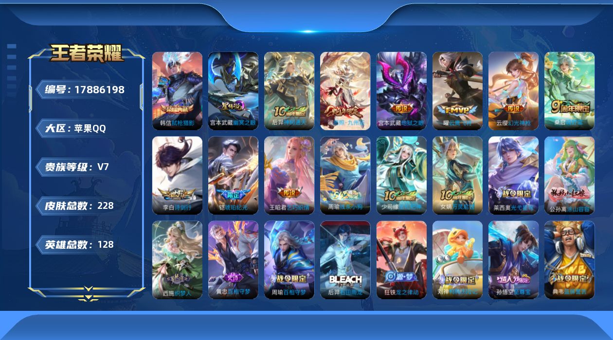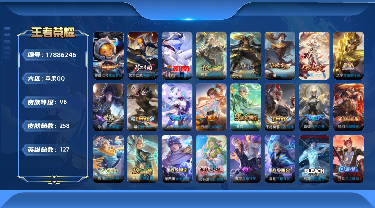 苹果QQ/荣耀王者/613皮肤/126英雄/3典藏/1珍品无双/9无双/9珍品传说/92传说/211