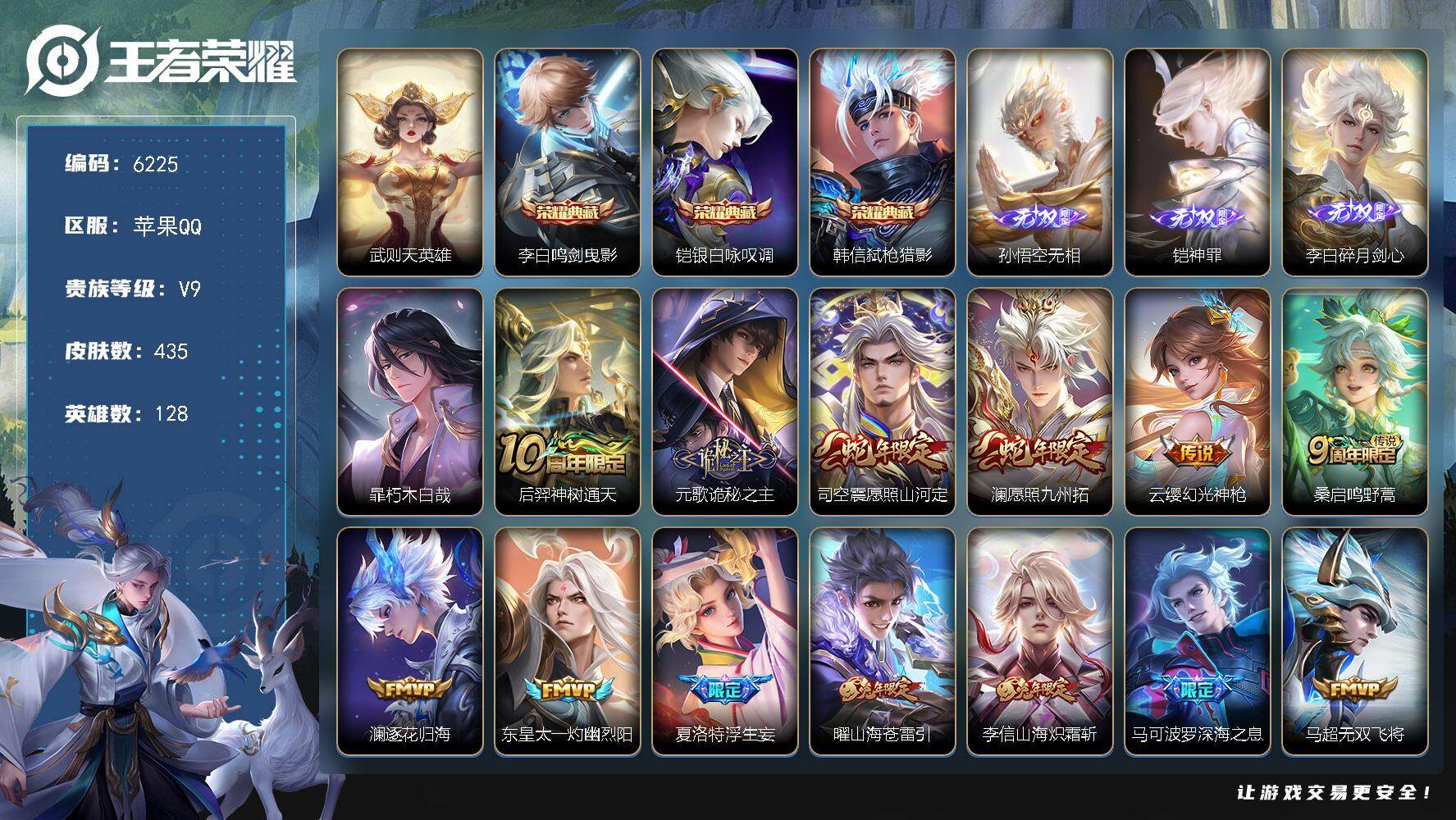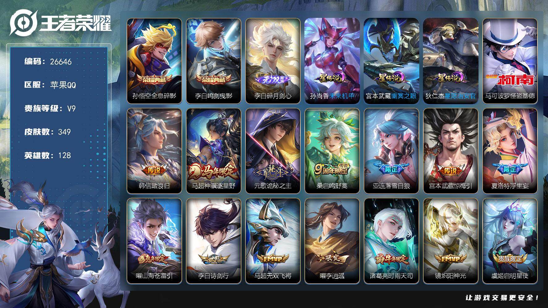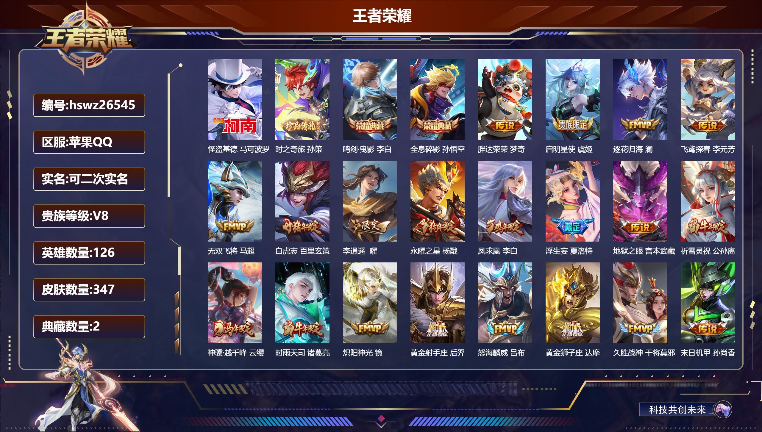 苹果QQ/荣耀王者/613皮肤/126英雄/3典藏/1珍品无双/9无双/9珍品传说/92传说/211