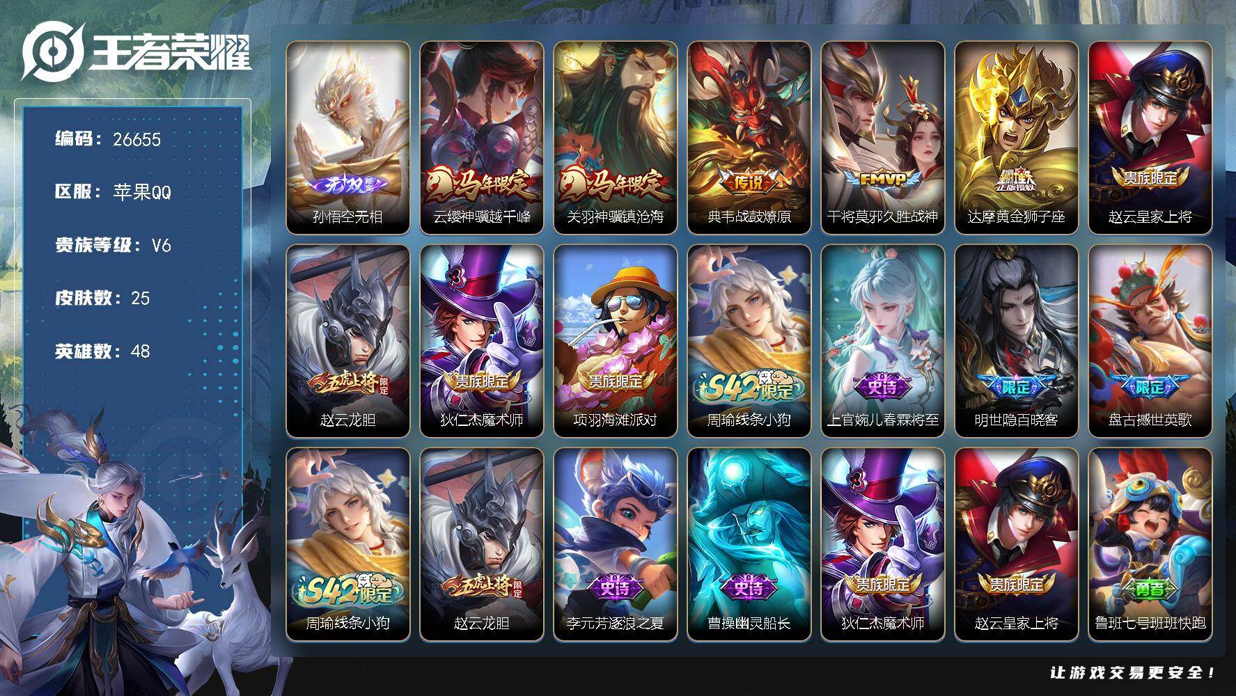 可换绑【精品小号·孙悟空无双·关羽云缨马限·百晓客·撼世英歌·龙胆·无二次包过