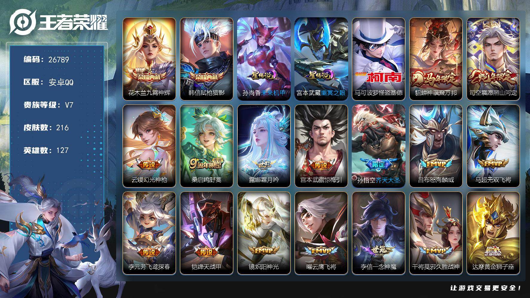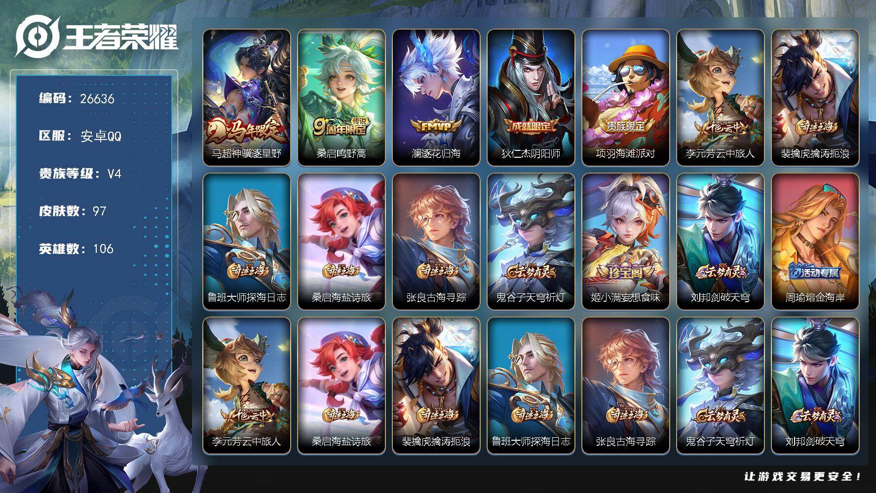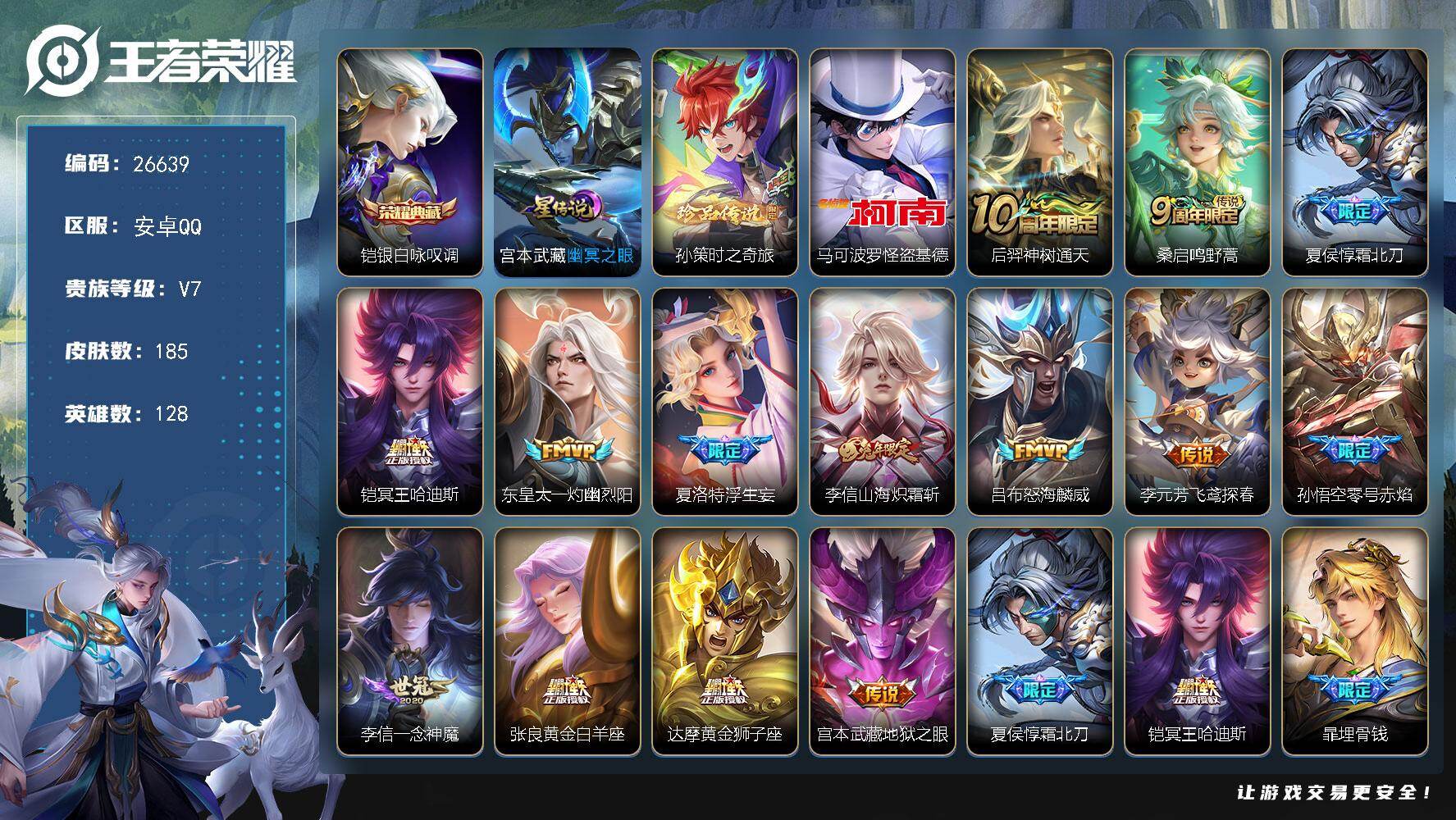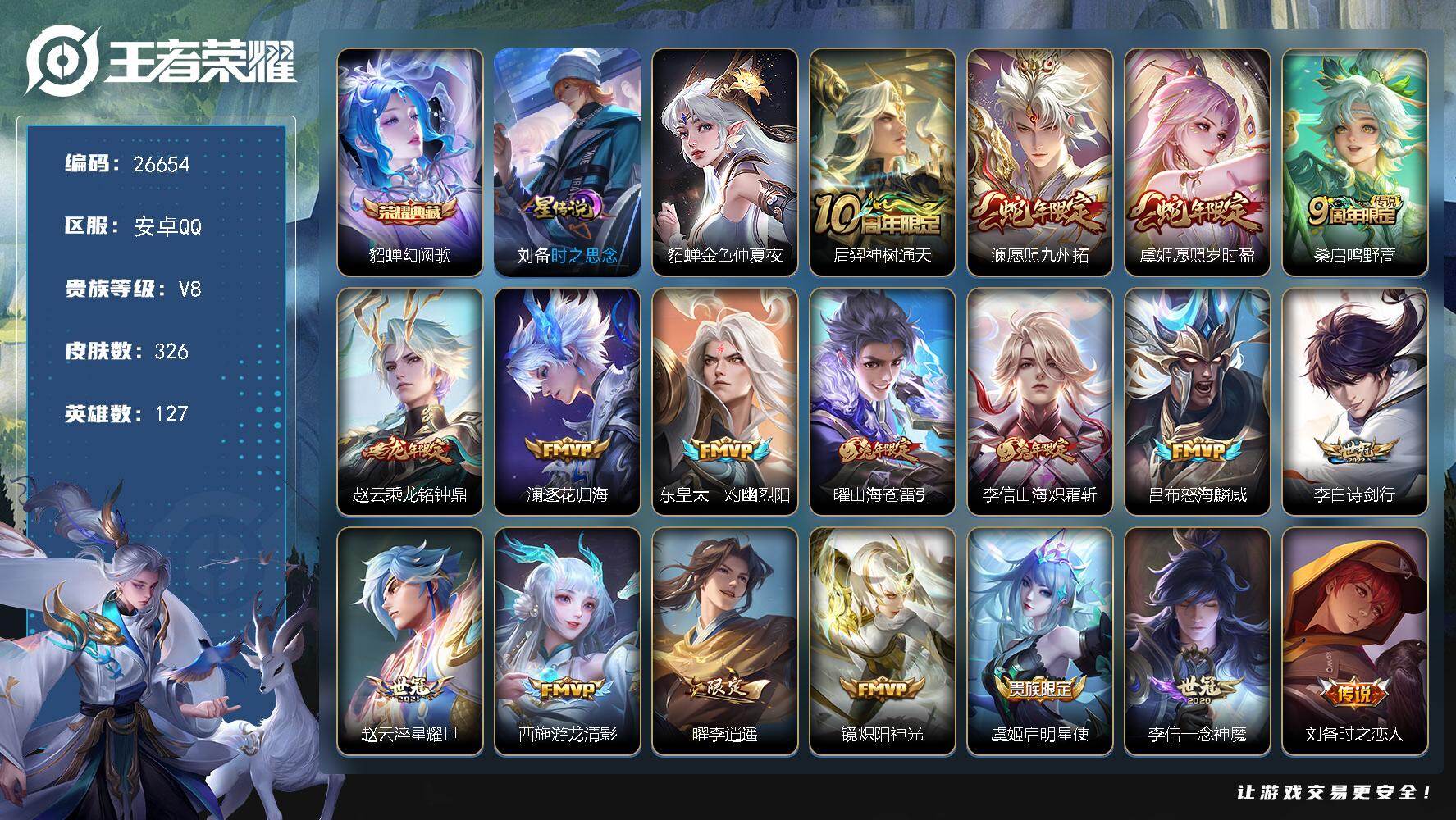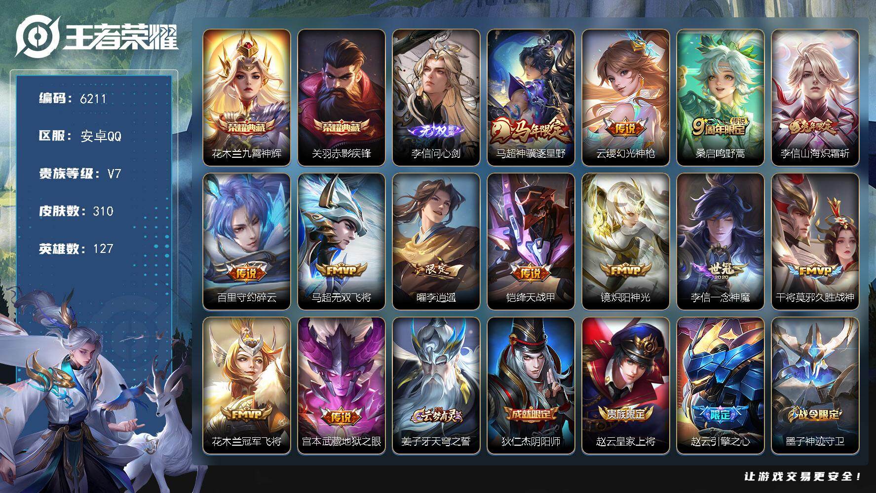 安卓QQ/至圣王者/150皮肤/111英雄/1典藏/1珍品无双/3无双/4珍品传说/15传说/49史