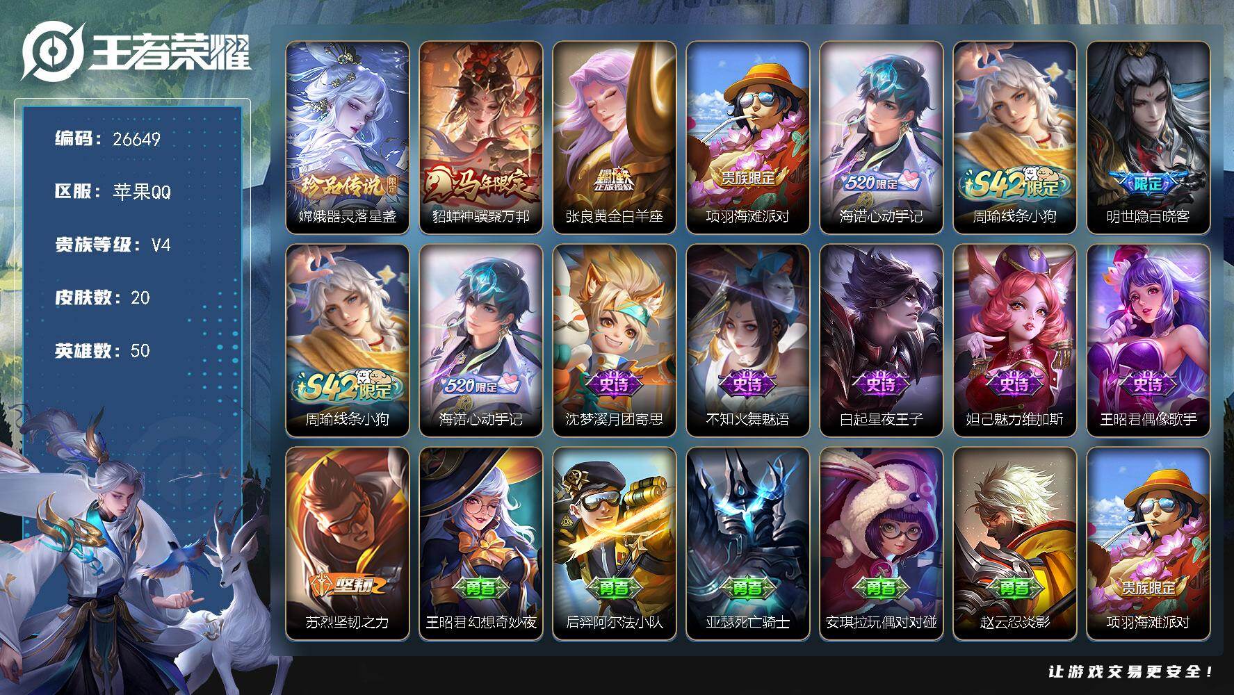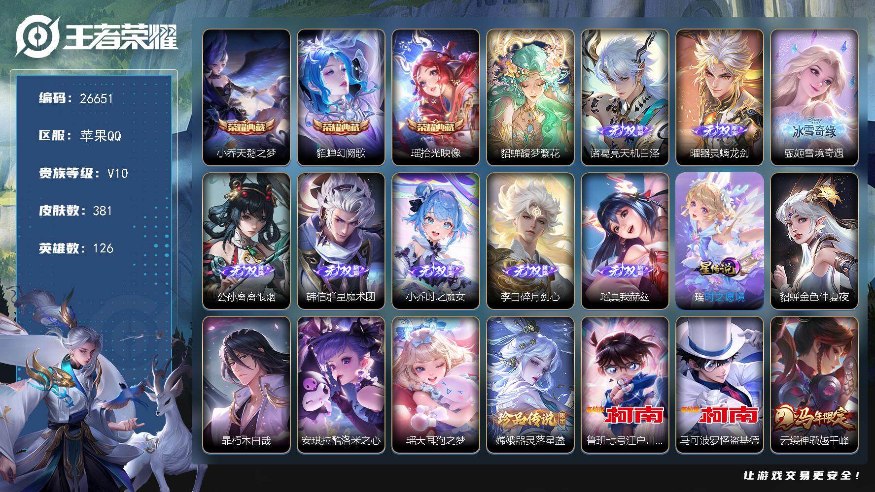 苹果QQ/绝世王者/347皮肤/126英雄/2典藏/0珍品无双/0无双/2珍品传说/24传说/102