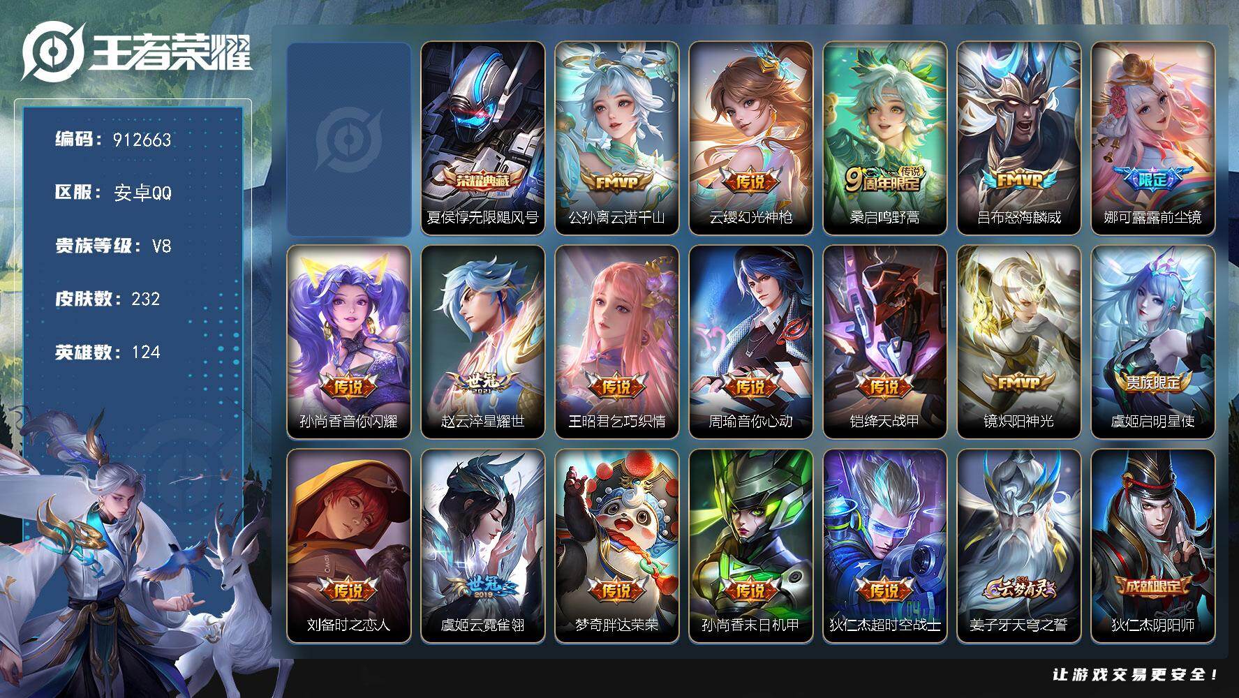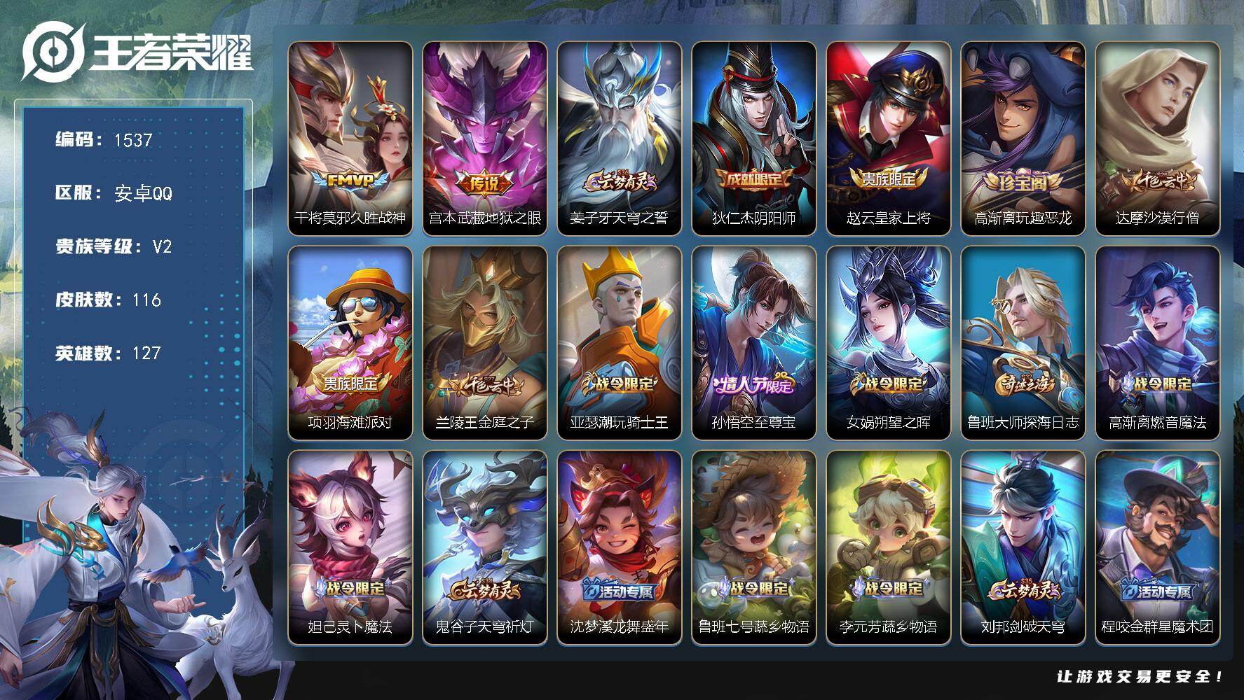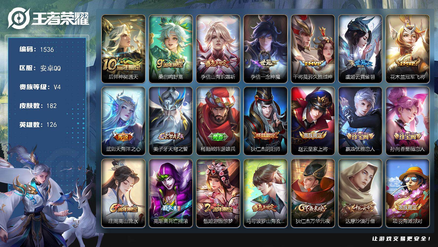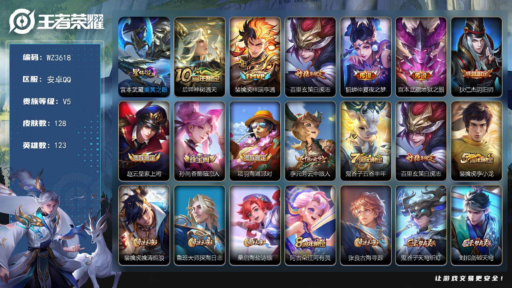 【秒换绑】安卓Q-V5-至尊星耀II段位-123英雄-128皮肤-5传说-32