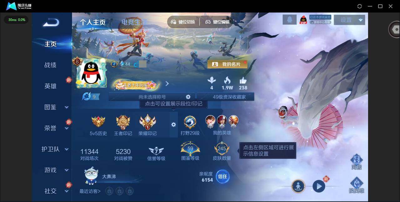 贵族等级: V8 英雄数: 128 皮肤数: 245 荣耀水晶: 鸣剑·曳影,