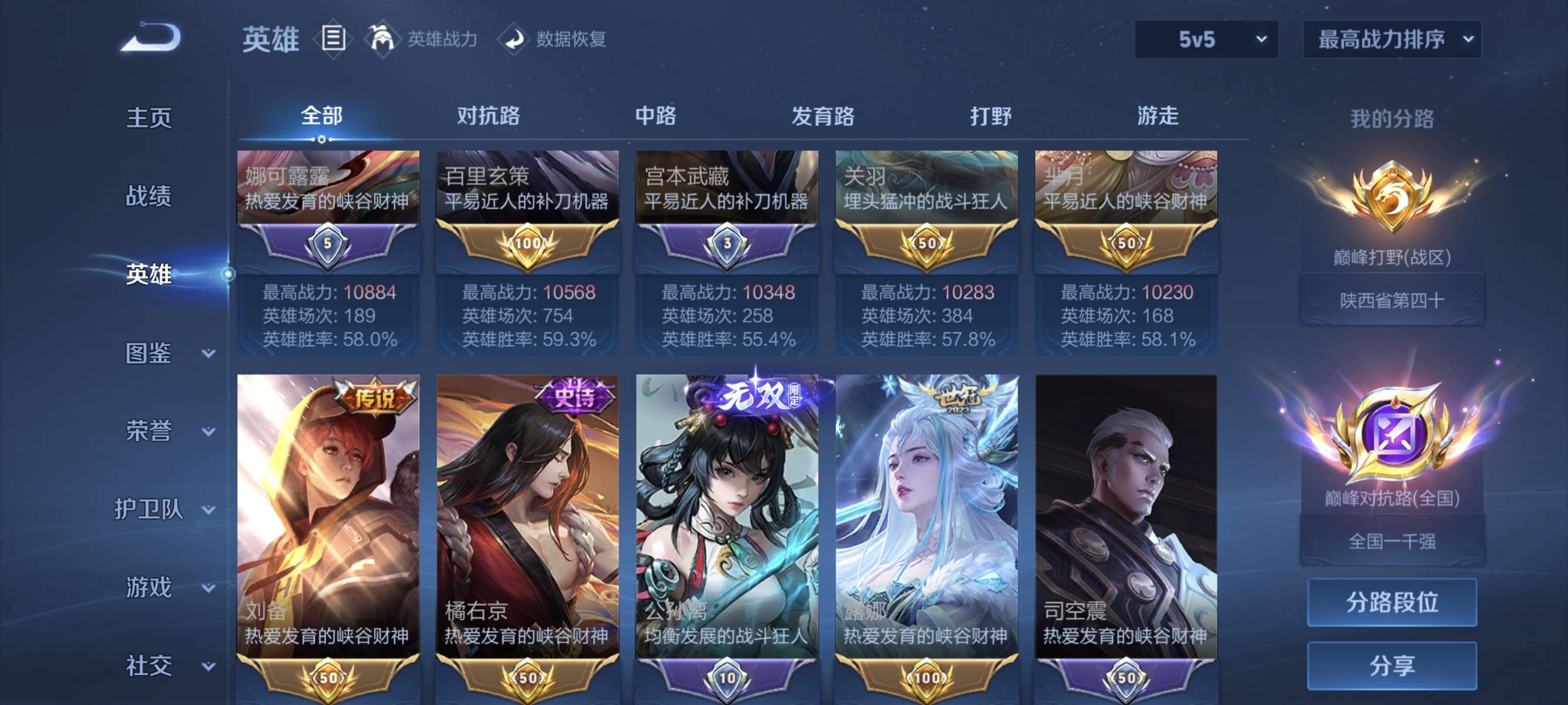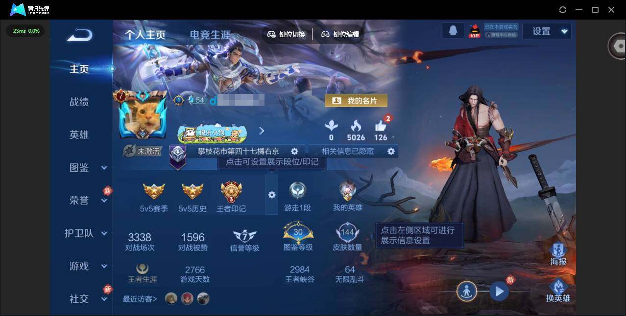 实名: 可修改 贵族等级: V7 英雄数: 123 皮肤数: 144 星传说:
