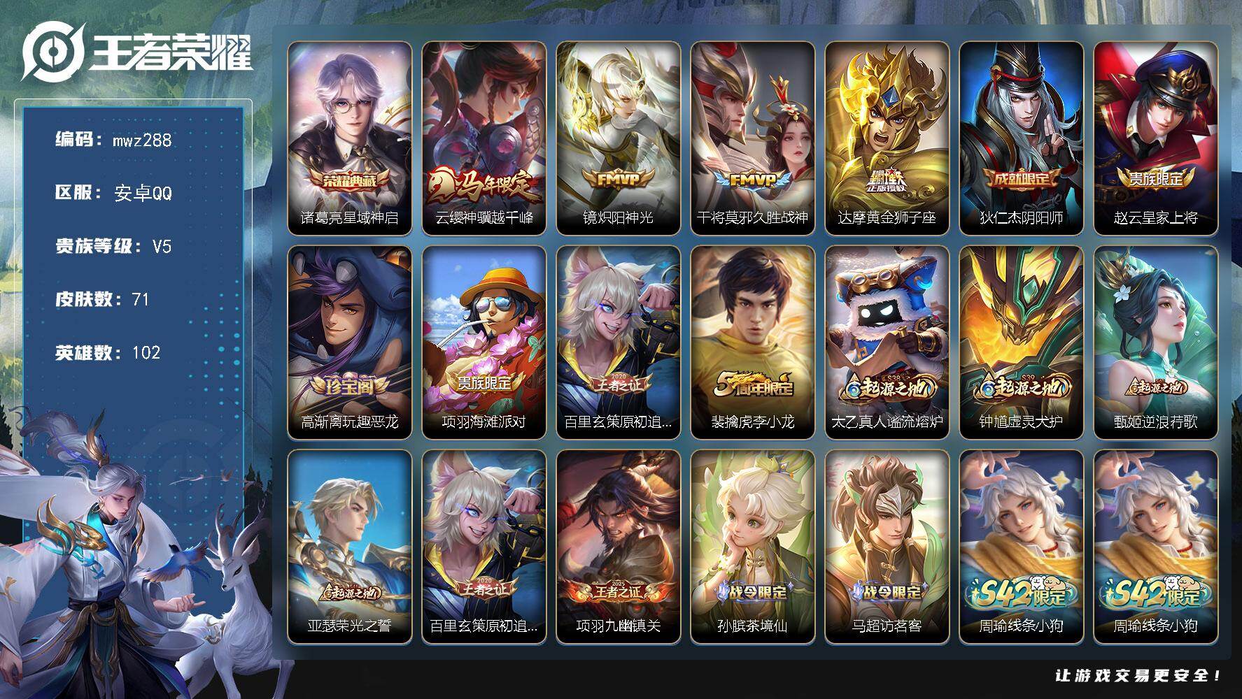 【mwz288】安卓Q-V5-最强王者段位-102英雄-71皮肤-1典藏皮肤-