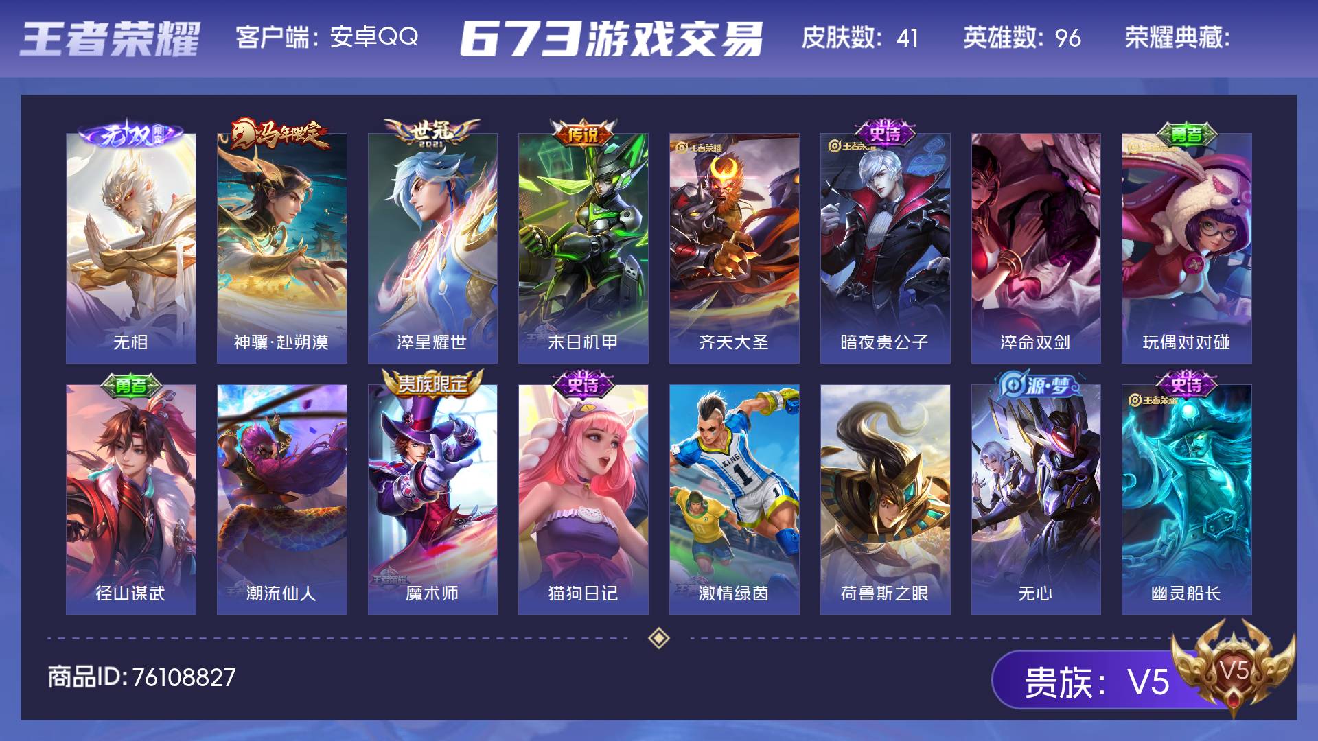 V5 皮肤41 英雄96 最强王者 无双皮肤1 传说4 其他皮肤43