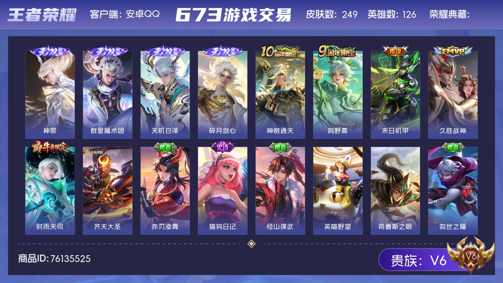 V6 皮肤249 英雄126 无双王者 无双皮肤4 传说6