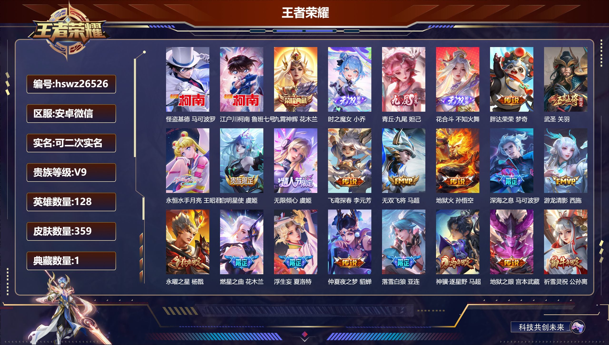 安卓微/绝世王者/359皮肤/128英雄/1典藏/0珍品无双/3无双/2珍品传说/43传说/103