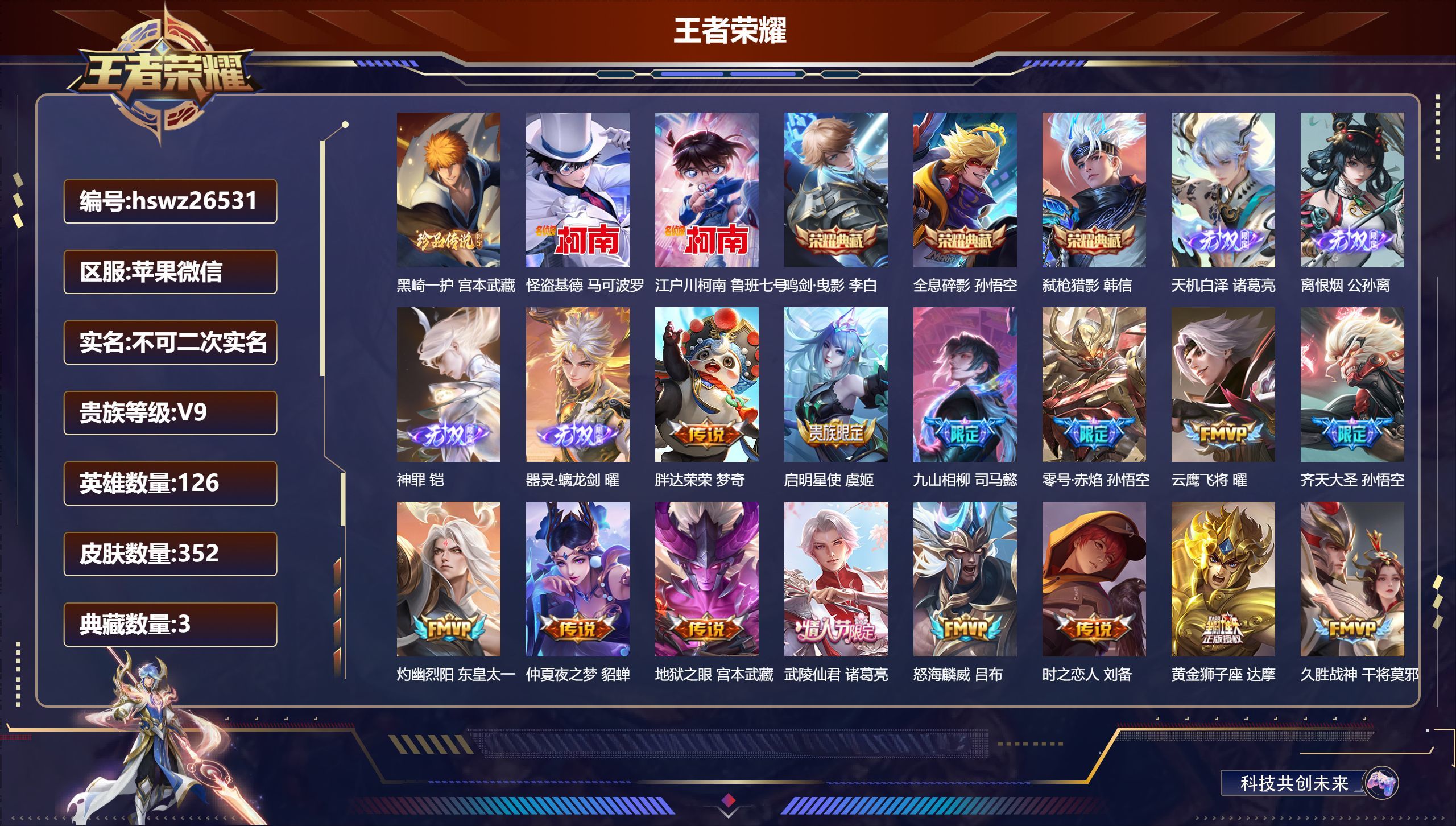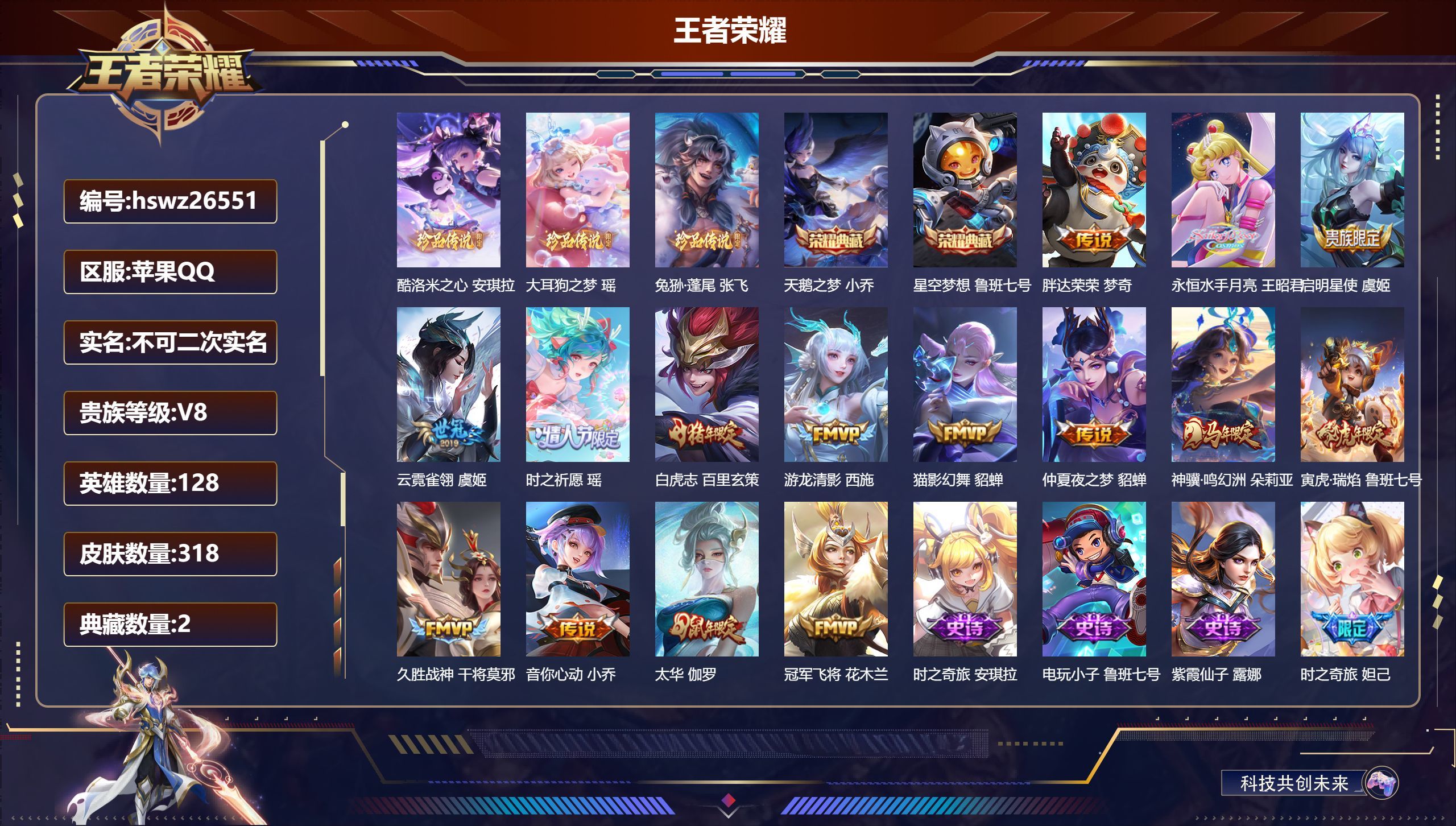 苹果QQ/至尊星耀/352皮肤/128英雄/2典藏/0珍品无双/4无双/5珍品传说/32传说/99史