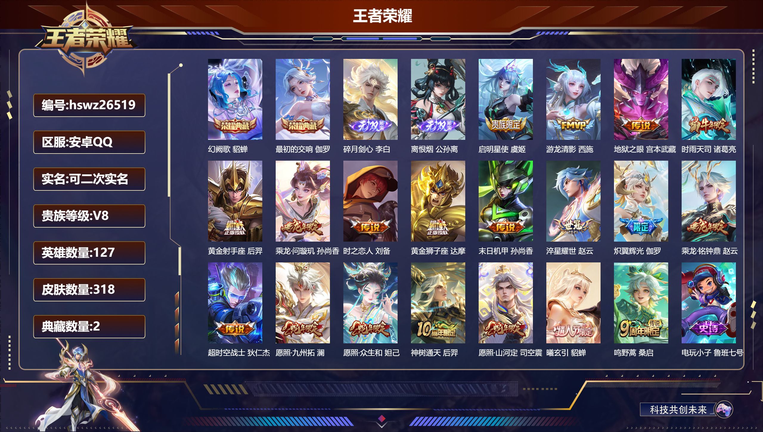 安卓QQ/至尊星耀/318皮肤/127英雄/2典藏/0珍品无双/2无双/0珍品传说/19传说/90史