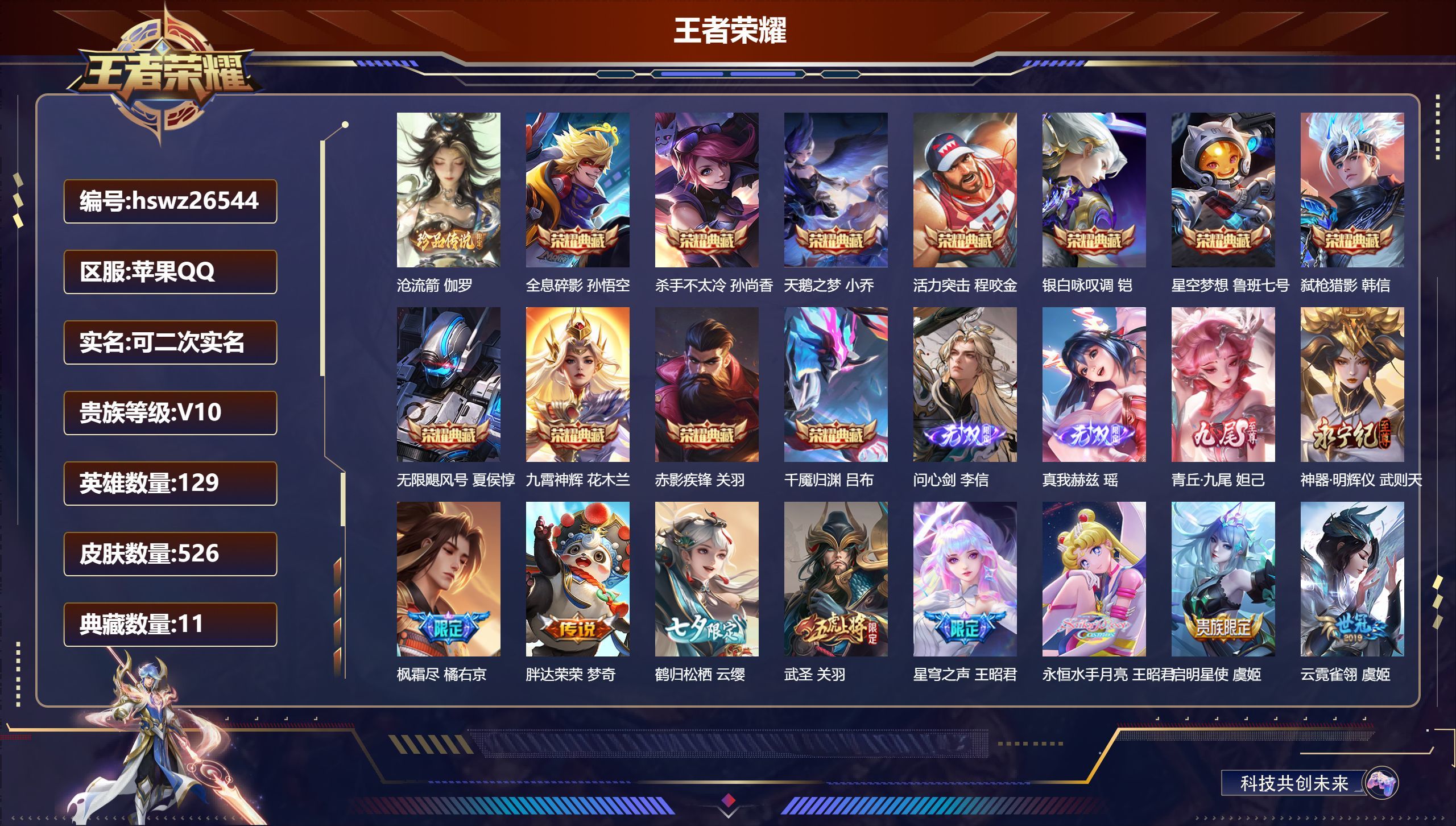 苹果QQ/荣耀王者/526皮肤/129英雄/11典藏/0珍品无双/4无双/1珍品传说/86传说/17