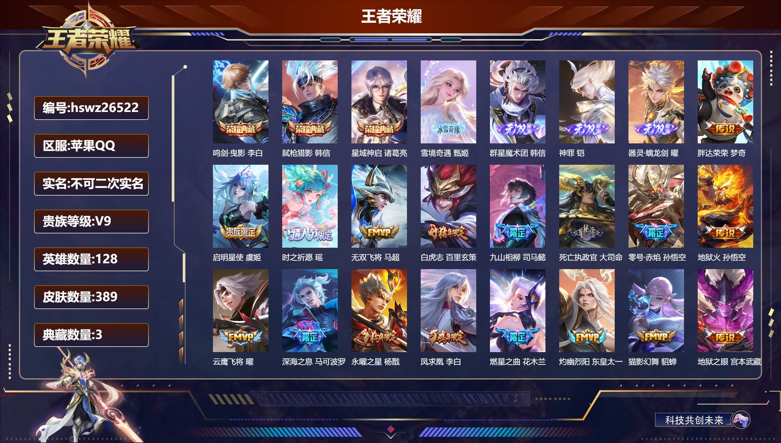 苹果QQ/荣耀王者/389皮肤/128英雄/3典藏/0珍品无双/4无双/0珍品传说/38传说/123