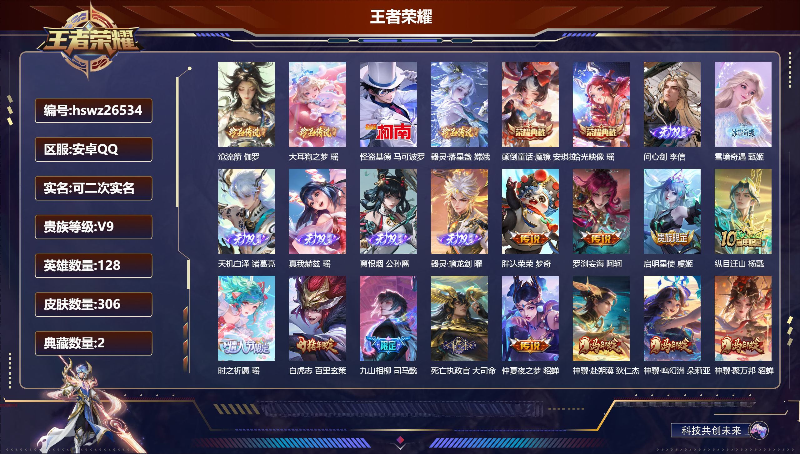 安卓QQ/荣耀王者/306皮肤/128英雄/2典藏/0珍品无双/6无双/4珍品传说/38传说/96史