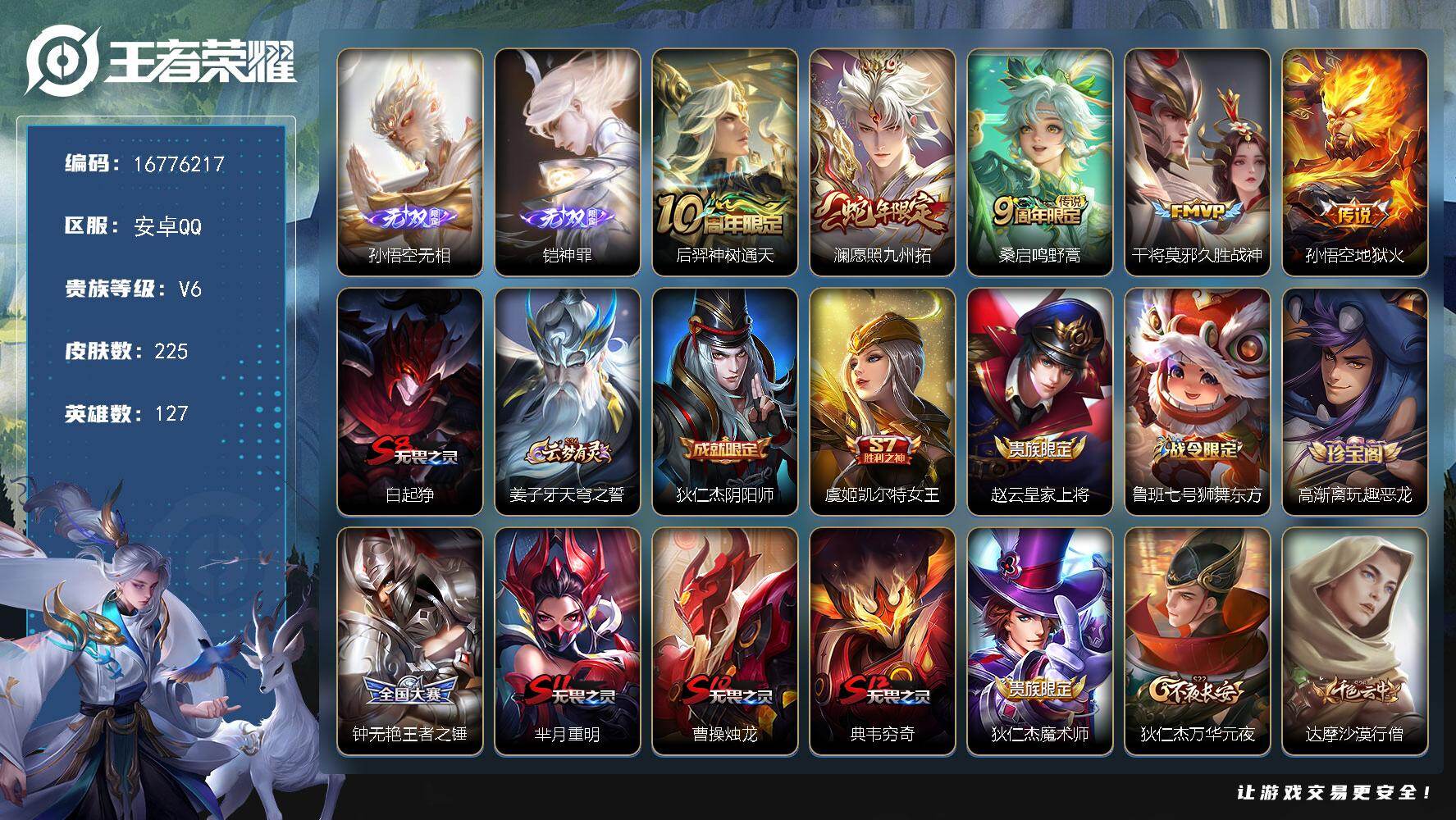 【16776217】安卓Q-V6-最强王者段位-127英雄-225皮肤-2无双