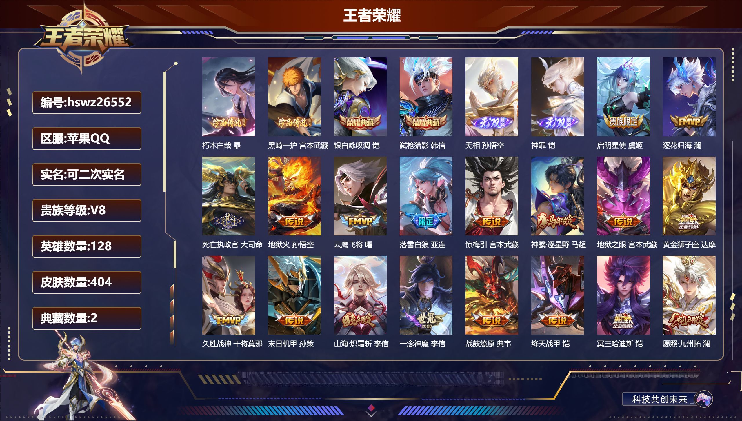 苹果QQ/荣耀王者/404皮肤/128英雄/2典藏/0珍品无双/2无双/2珍品传说/21传说/113