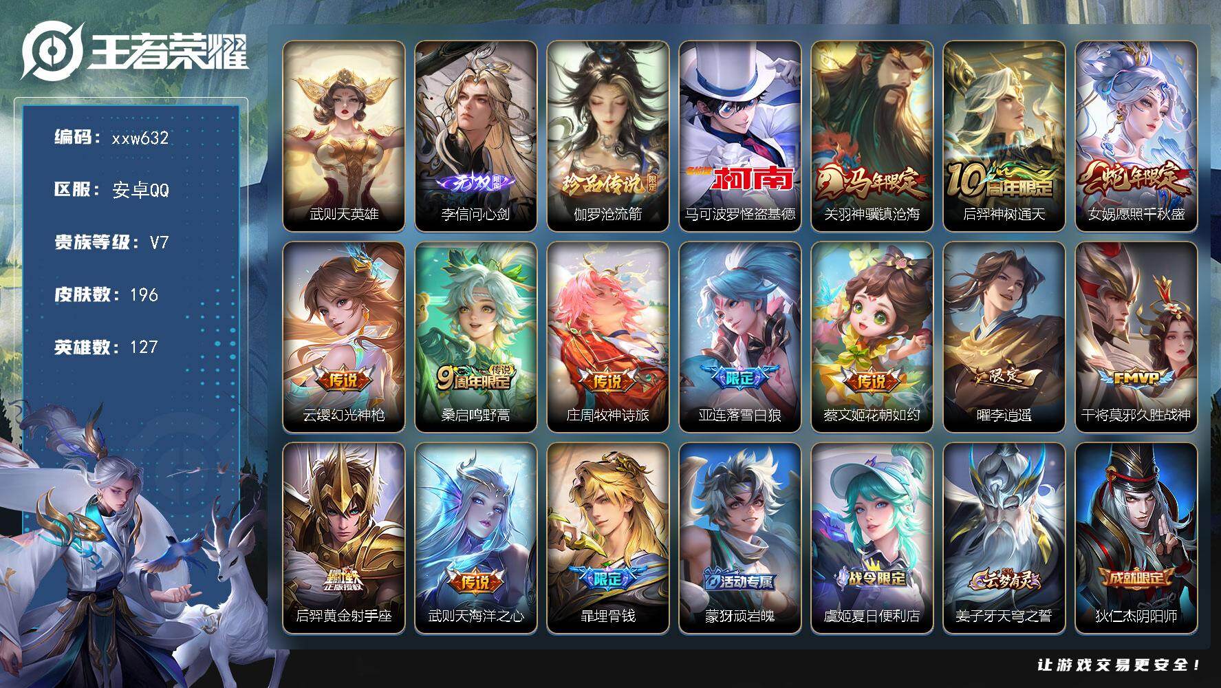 贵族7/皮肤196/传说12/史诗62/英雄127/空空儿全皮/