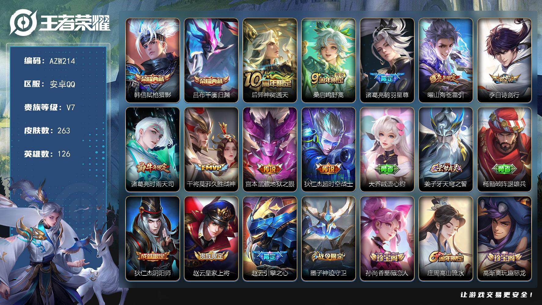 【AZW214】安卓Q-V7-最强王者段位-126英雄-263皮肤-2典藏皮肤