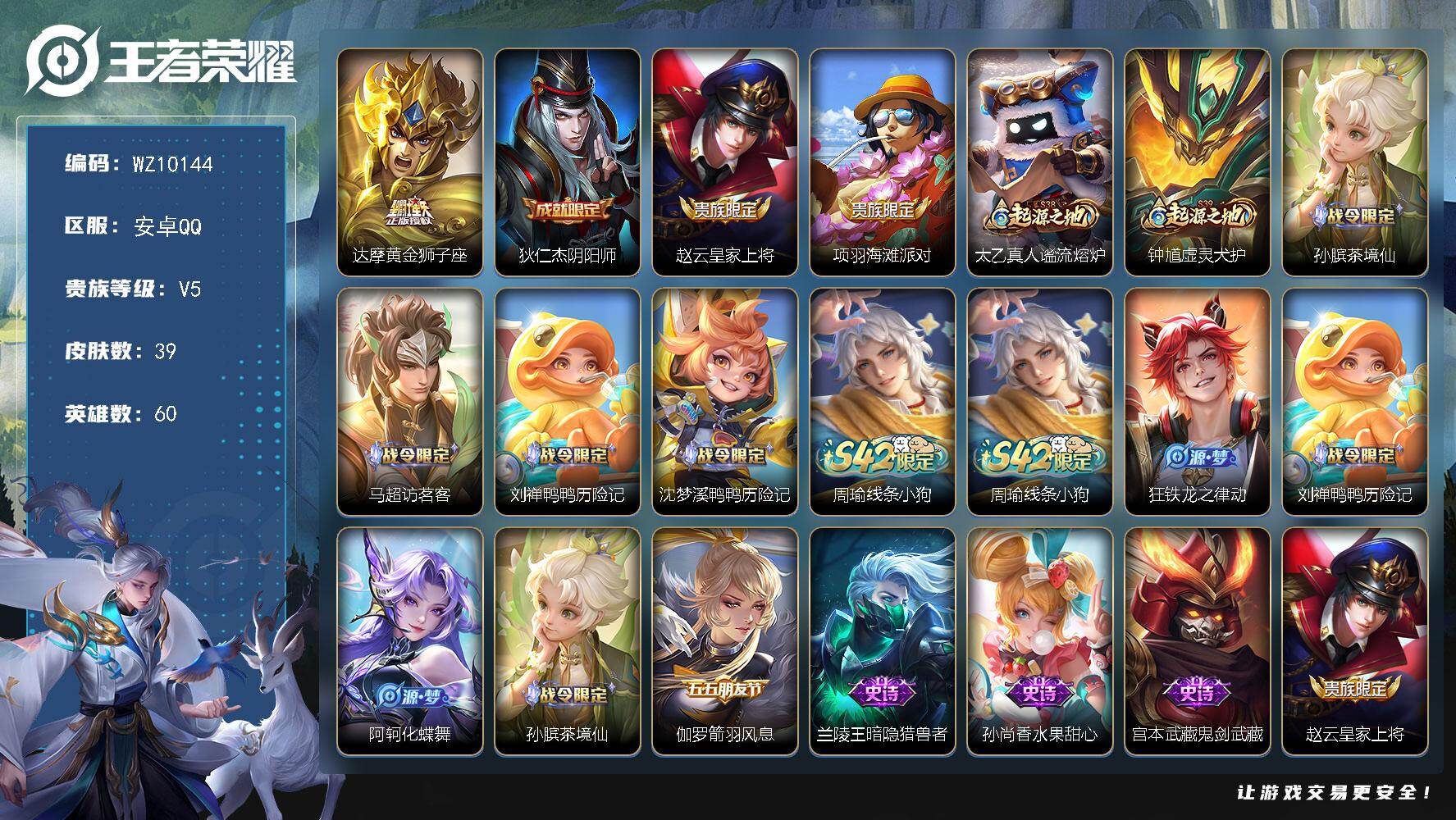 安卓Q-V5-尊贵铂金IV段位-60英雄-39皮肤-1传说-10史诗【传说皮