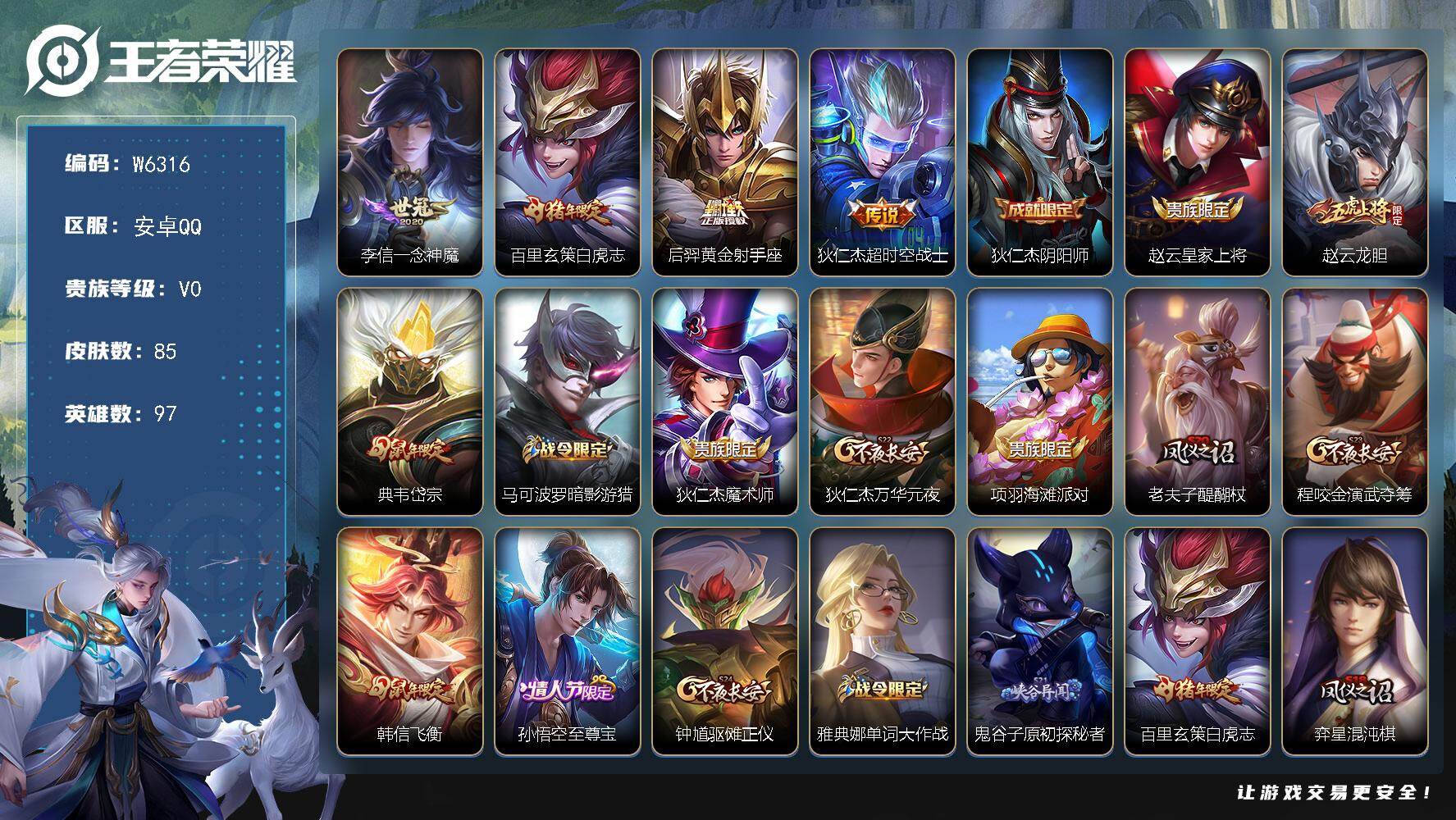 贵6-97英雄-85皮肤-4传说-28限定-1个性按键.贵族积分1.1万