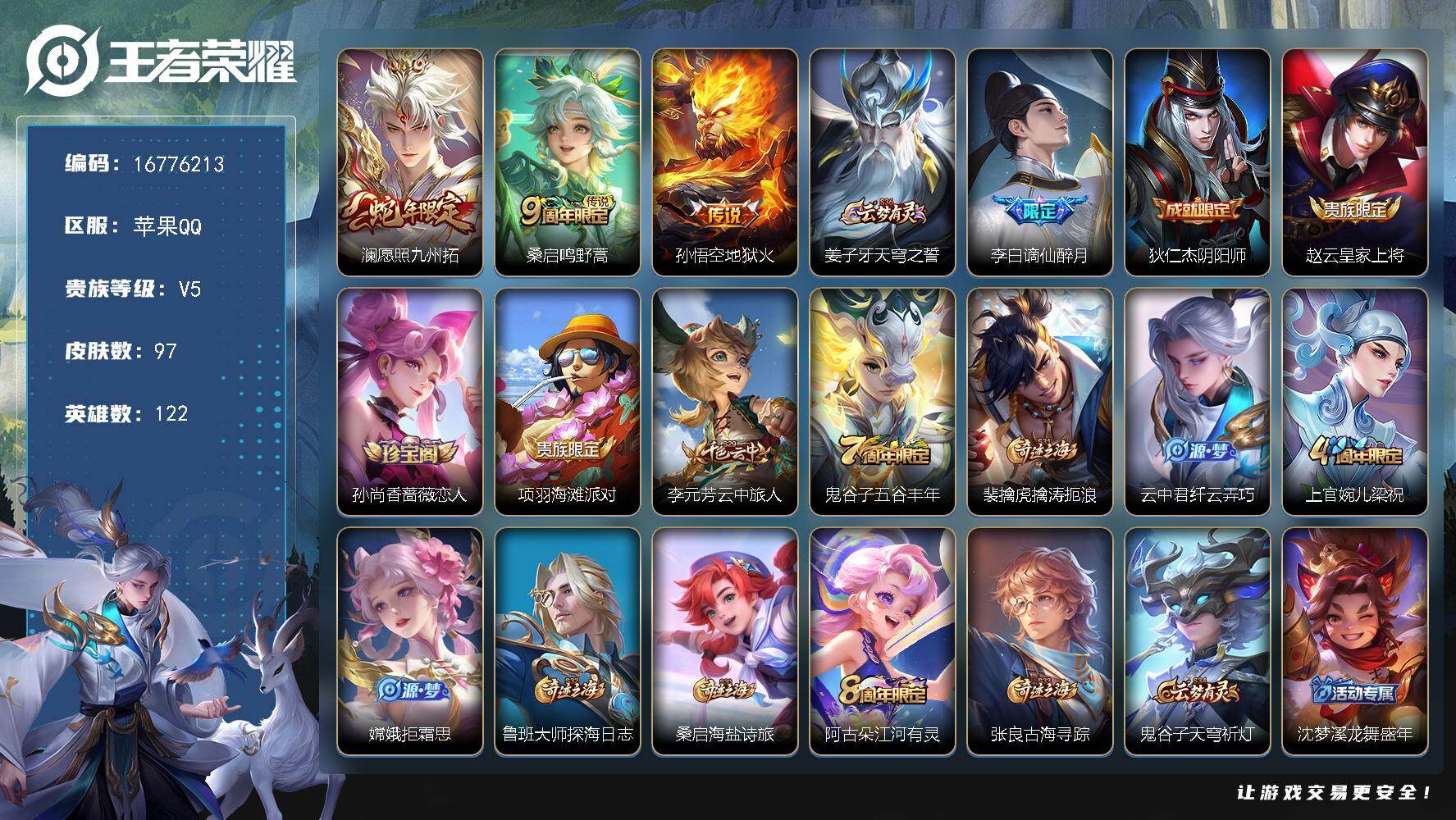 【16776213】苹果Q-V5-最强王者段位-122英雄-97皮肤-3传说-