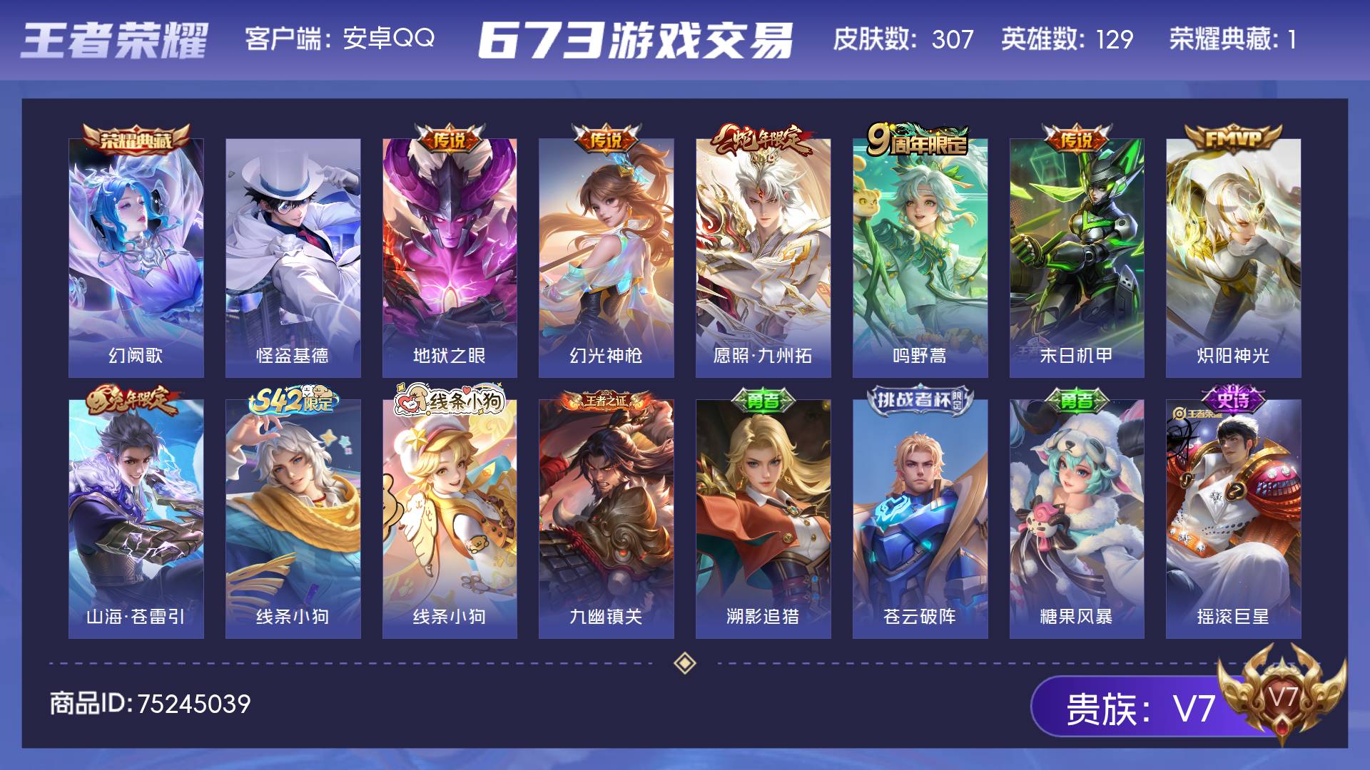V7 皮肤307 英雄129 非凡王者 荣耀典藏1 珍品传说1 星传说2 传说7 其他皮肤304