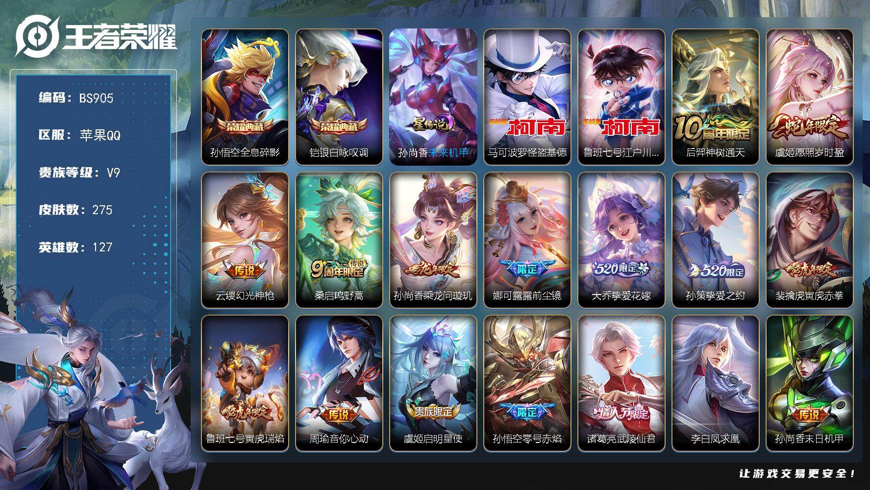 苹果Q V8-1天幕-245皮肤-1典藏皮肤-11传说-67史诗-71限定【