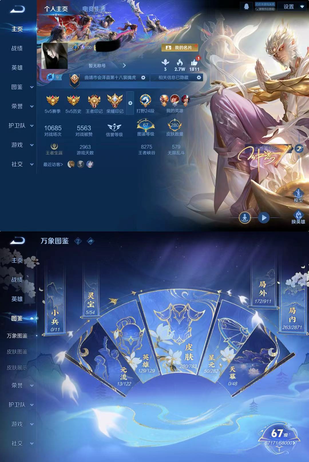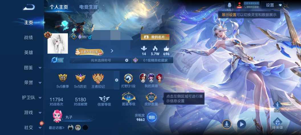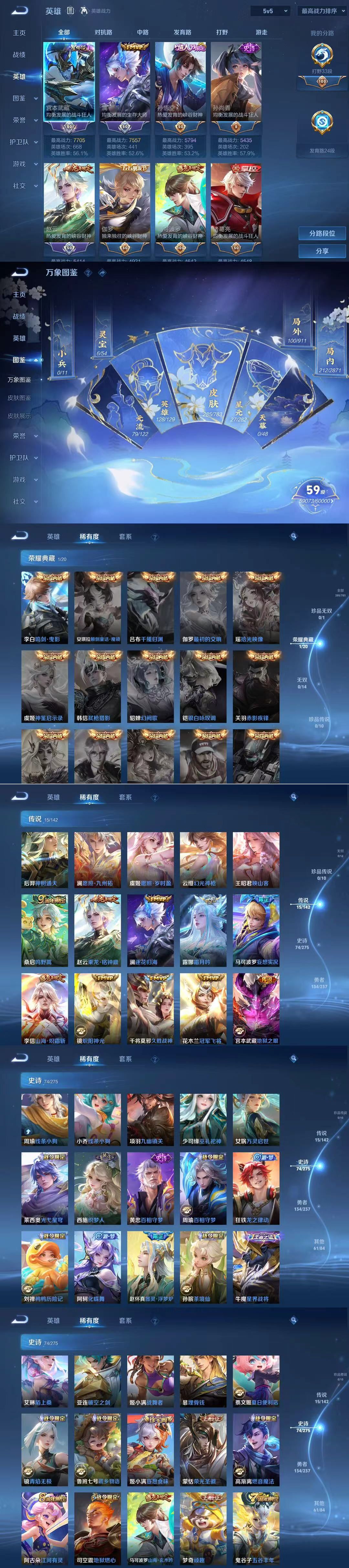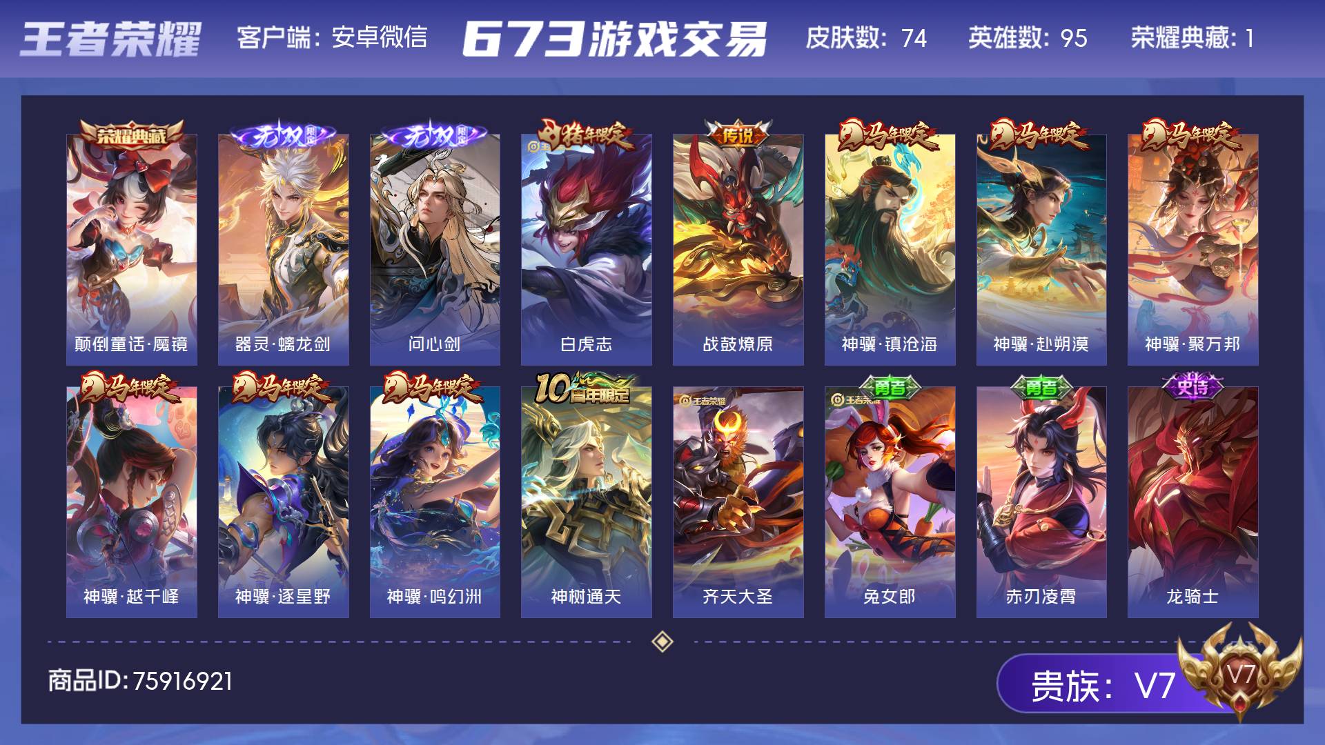 V7 皮肤74 英雄95 至尊星耀 荣耀典藏1 无双皮肤2 传说10 其他皮肤66