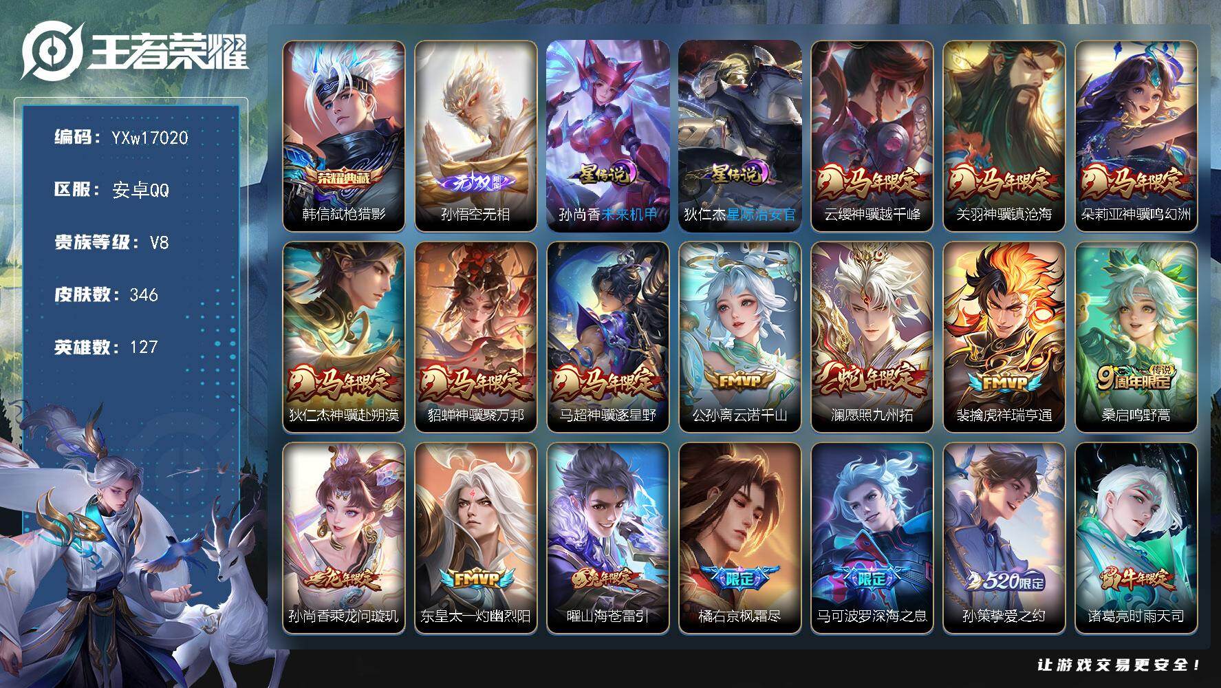 127英雄-346皮肤-18王者印记-300铭文-贵族积分6w