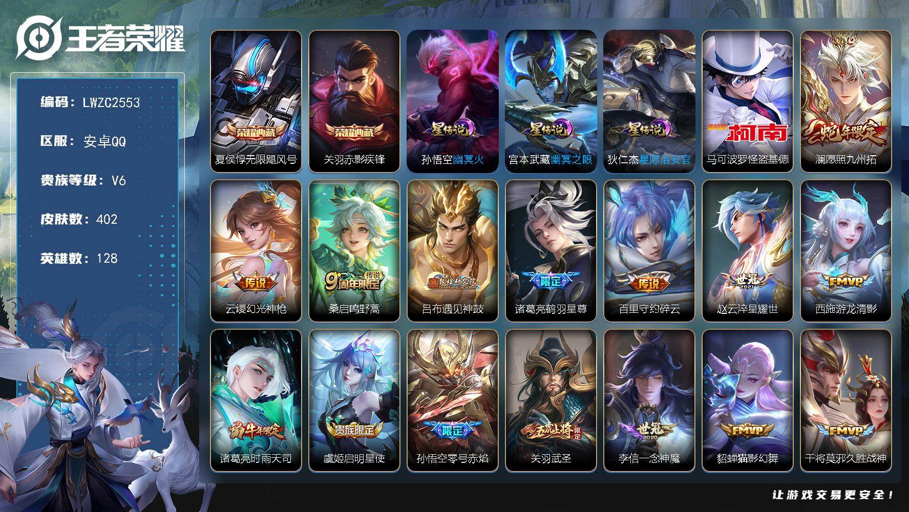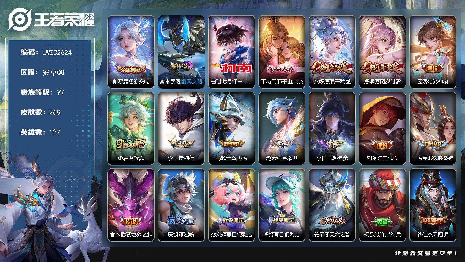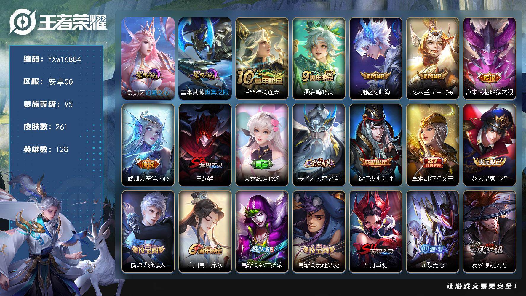 实名: 可修改 贵族等级: V5 英雄数: 95 皮肤数: 75 传说皮: 久