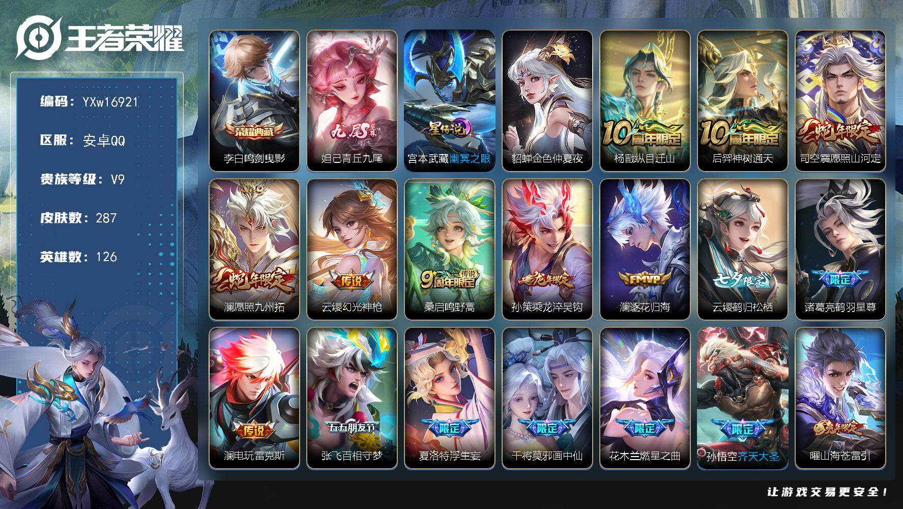 126英雄-287皮肤-16王者印记-190铭文-贵族积分11w
