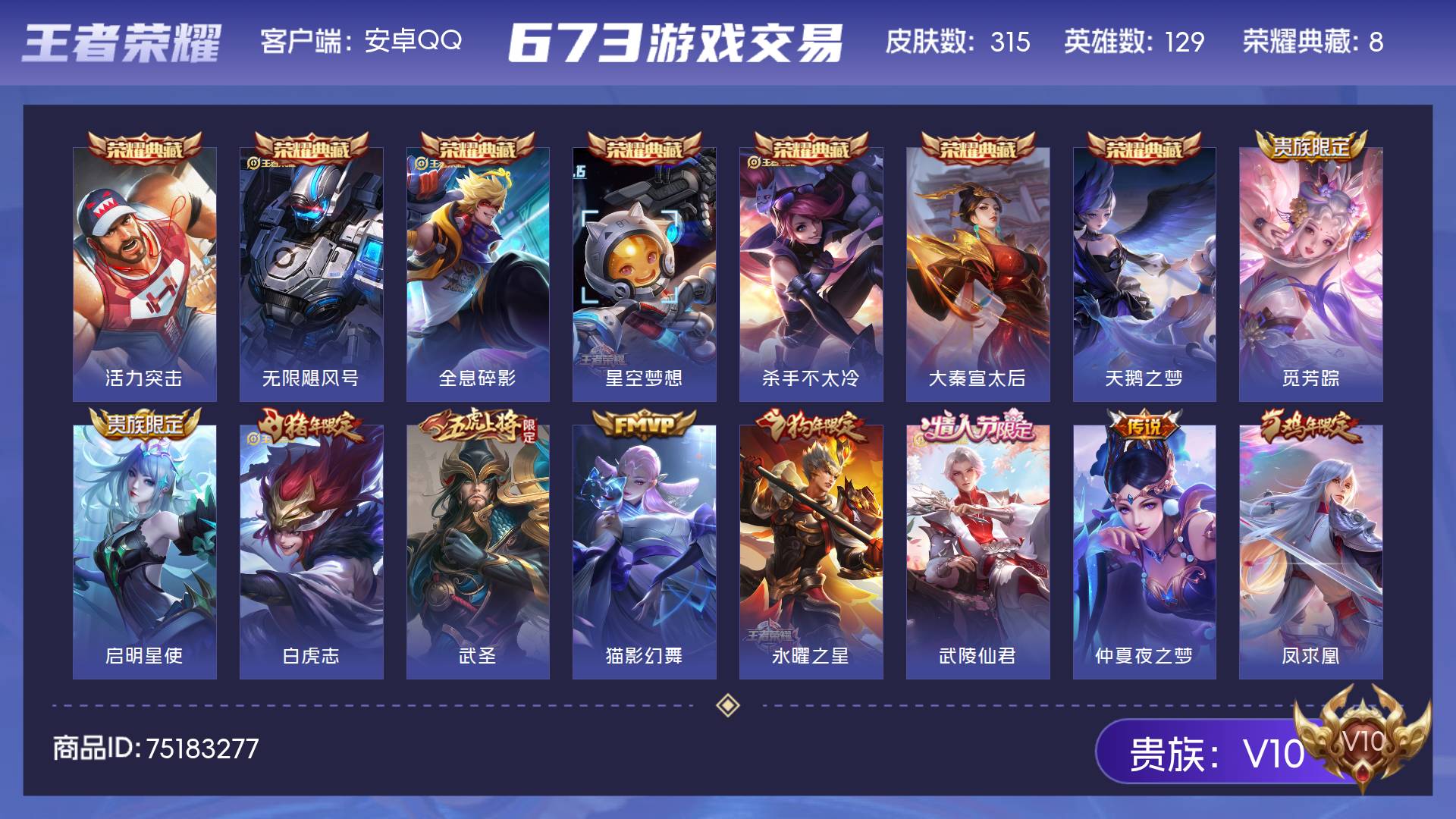 V10 皮肤315 英雄129 尊贵铂金 荣耀典藏8 传说14 其他皮肤300