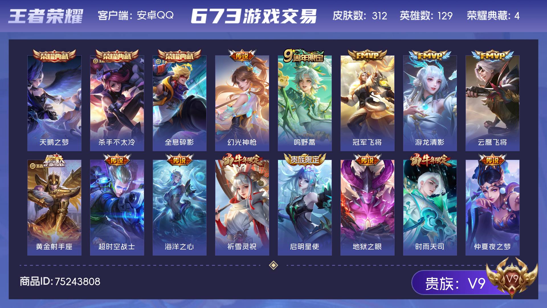 V9 皮肤312 英雄129 无双王者 荣耀典藏4 传说18 其他皮肤297