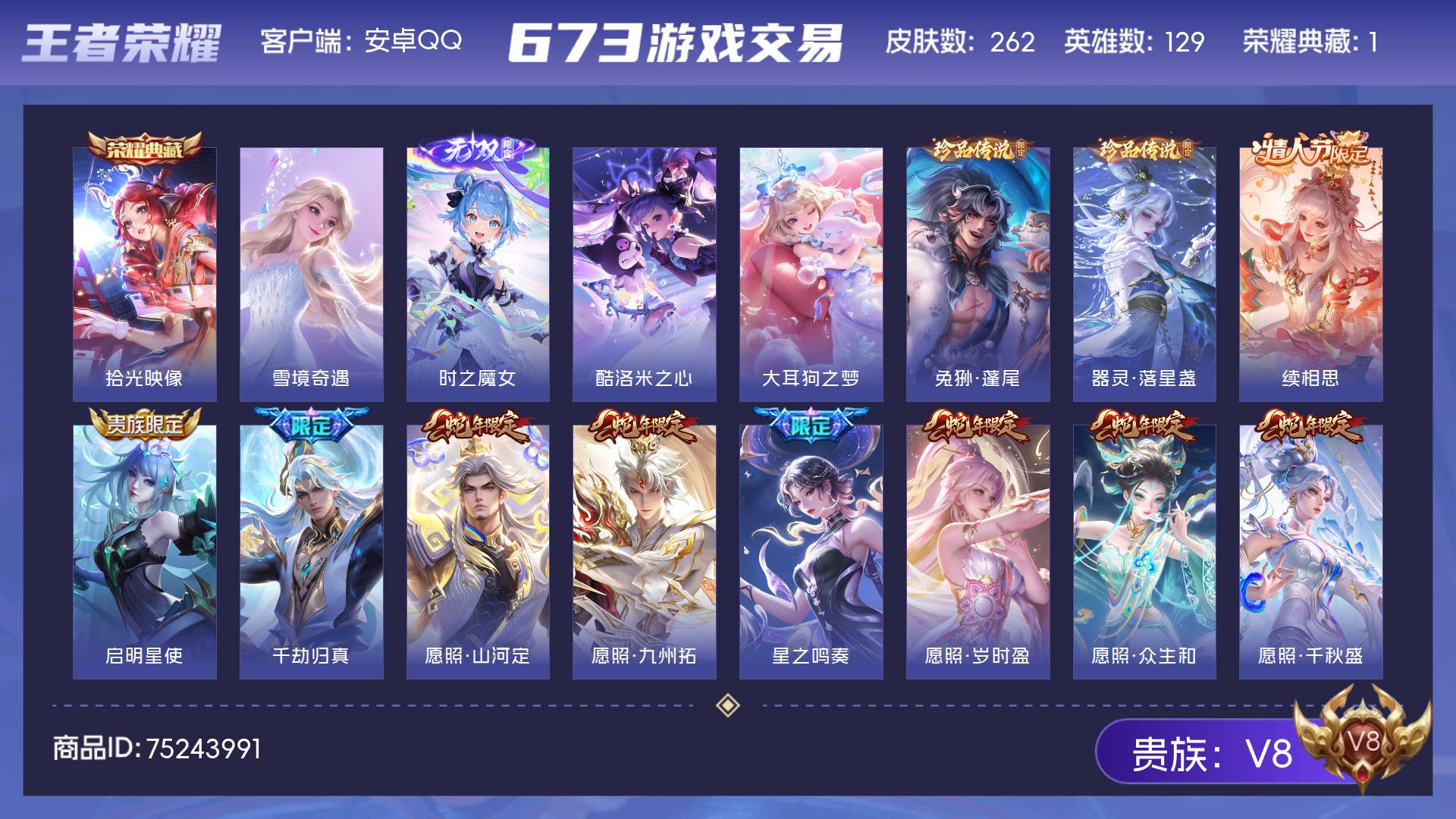 V8 皮肤262 英雄129 永恒钻石 荣耀典藏1 无双皮肤2 珍品传说4 传说16 其他皮肤245