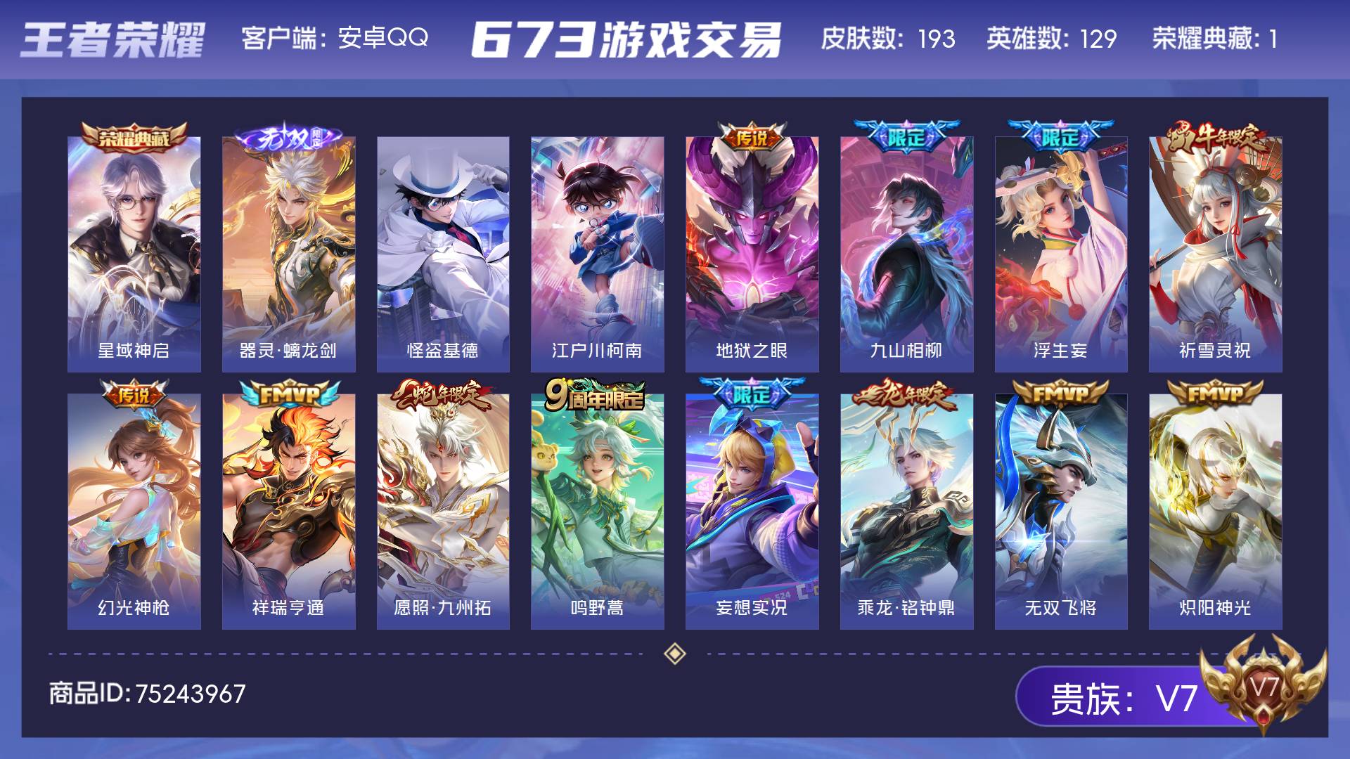 V7 皮肤193 英雄129 永恒钻石 荣耀典藏1 无双皮肤1 珍品传说2 传说14 其他皮肤181
