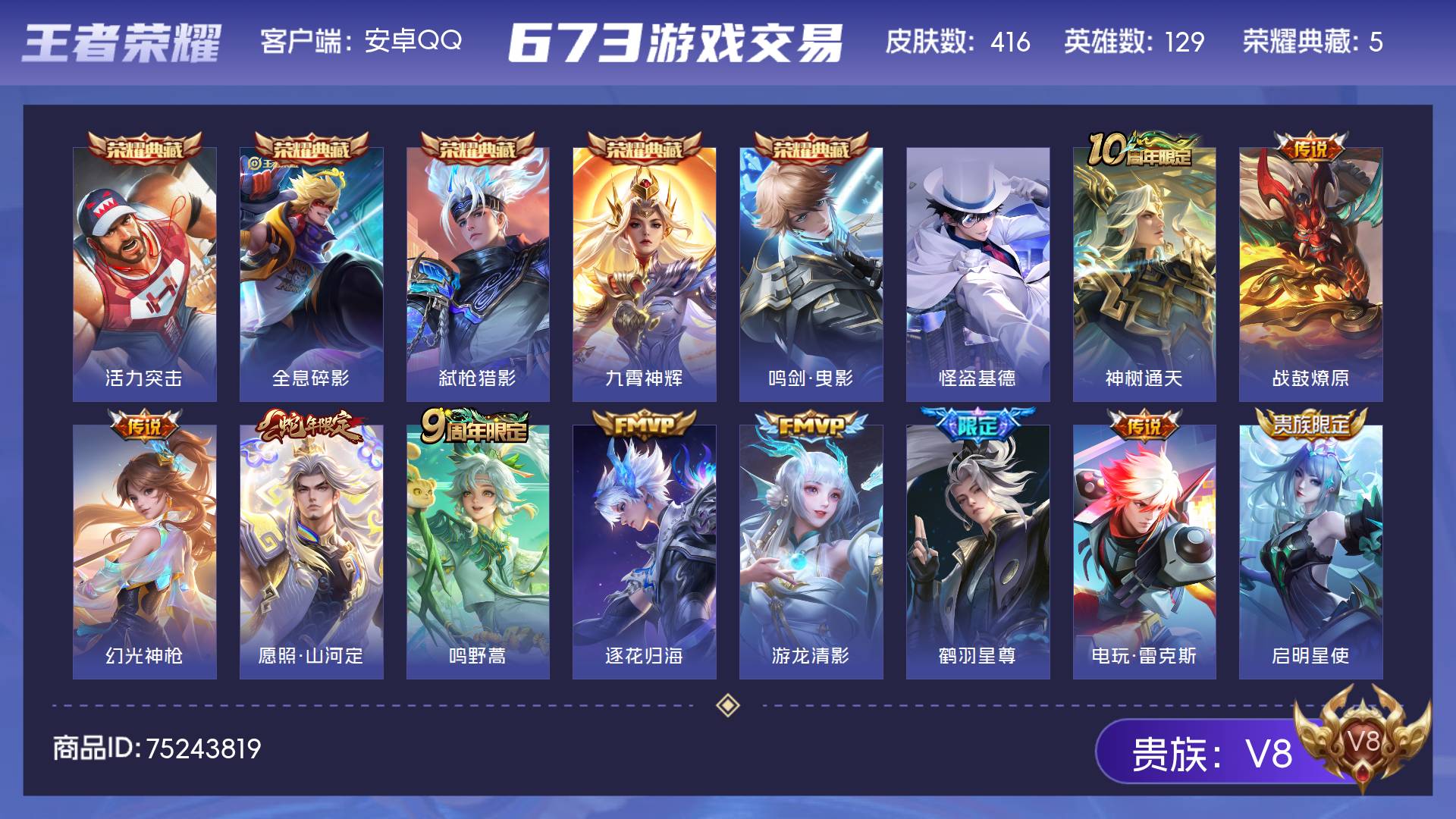 V8 皮肤416 英雄129 永恒钻石 荣耀典藏5 珍品传说1 传说17 其他皮肤399