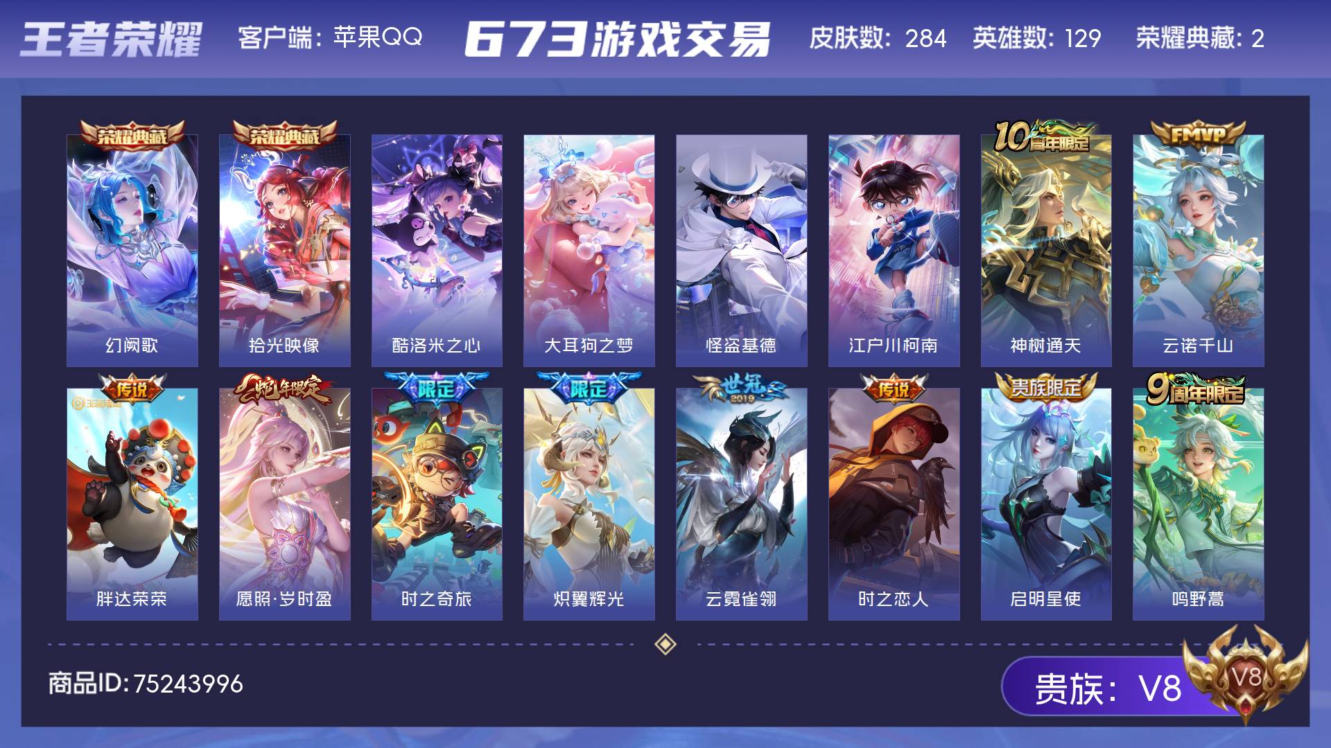 V8 皮肤284 英雄129 至尊星耀 荣耀典藏2 珍品传说4 传说10 其他皮肤274
