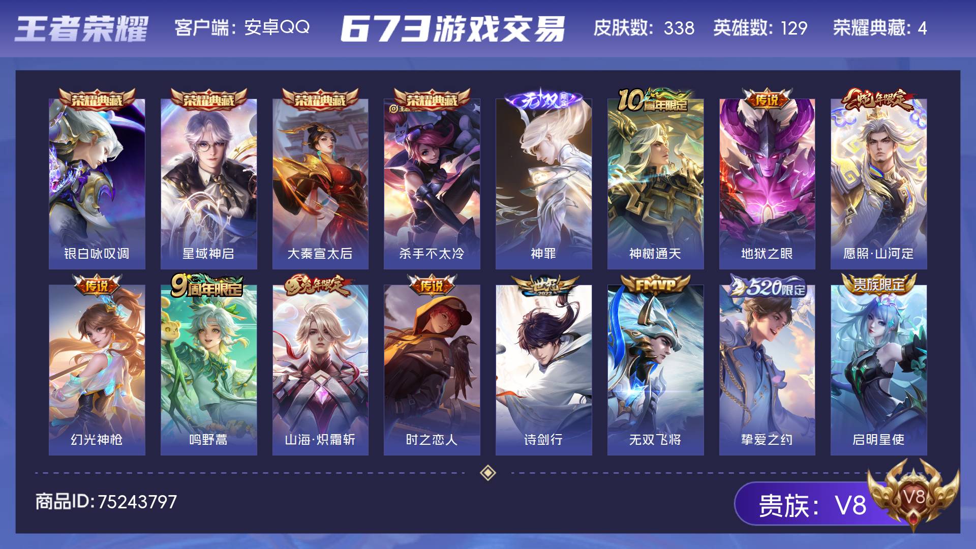 V8 皮肤338 英雄129 最强王者 荣耀典藏4 无双皮肤1 传说15 其他皮肤324