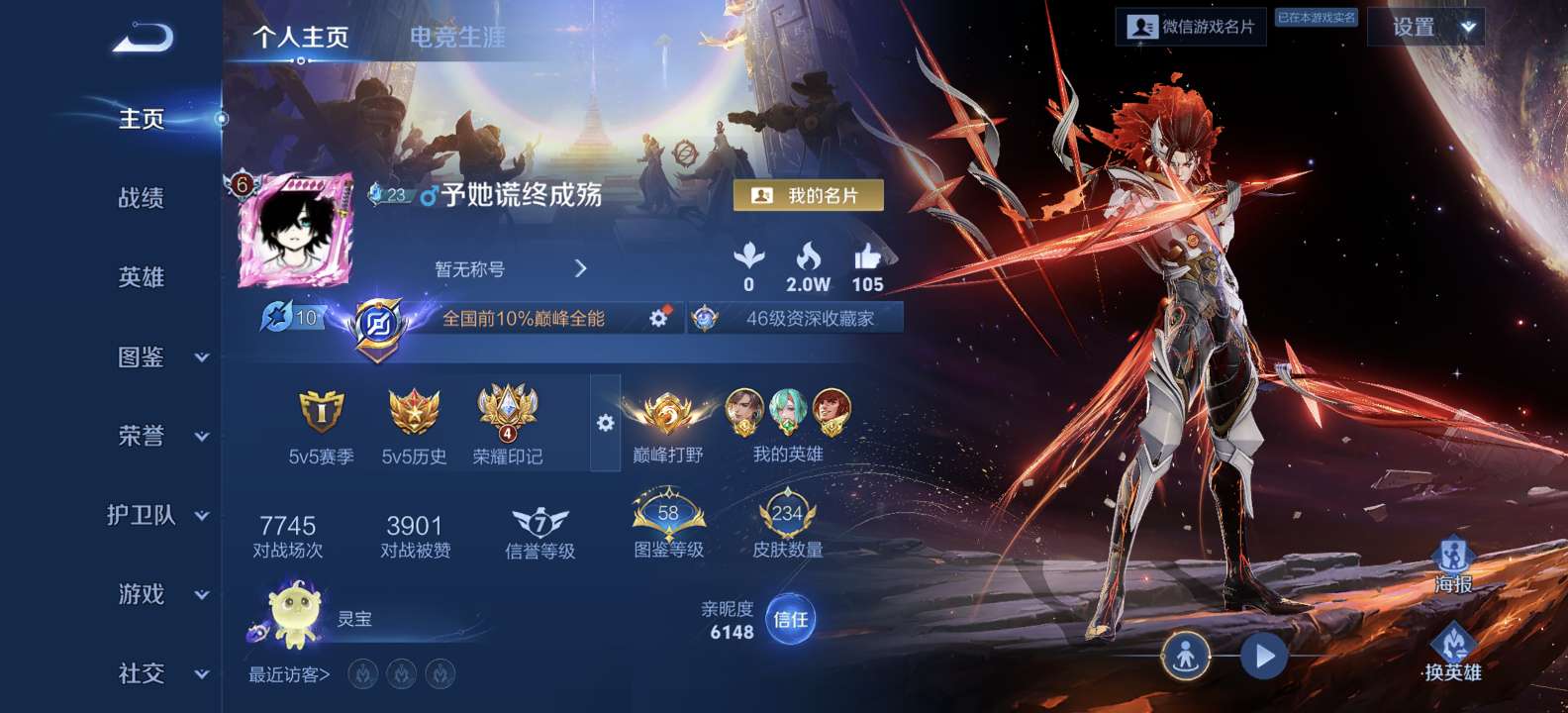 【金标干将莫邪】实名: 可修改 贵族等级: V7 英雄数: 115 皮肤数:
