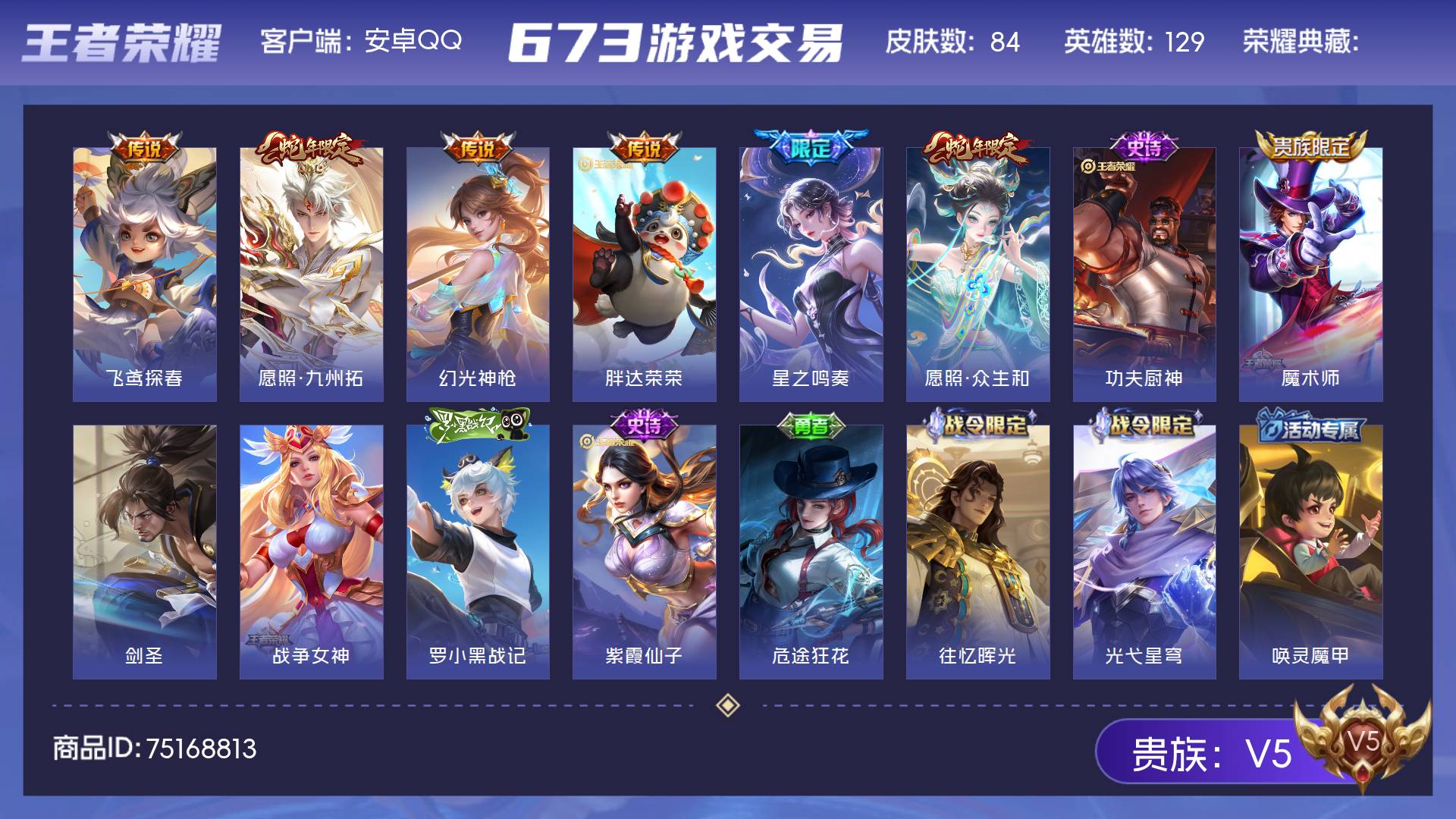 V5 皮肤84 英雄129 永恒钻石 传说6 其他皮肤83