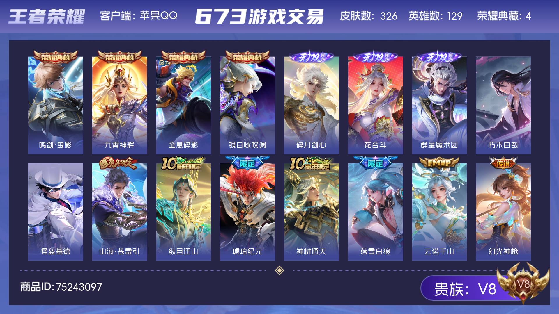 V8 皮肤326 英雄129 至尊星耀 荣耀典藏4 无双皮肤3 珍品传说2 传说25 其他皮肤297