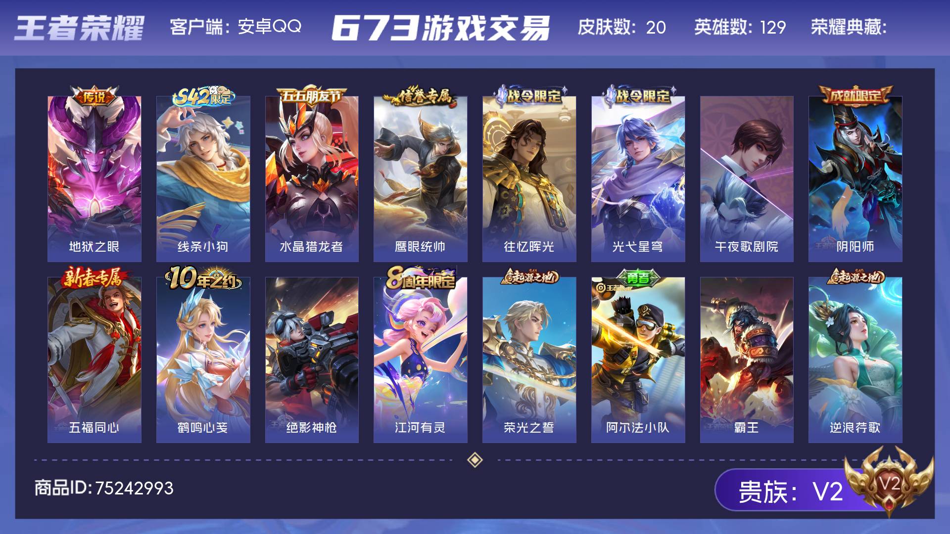 V2 皮肤20 英雄129 至尊星耀 传说1 其他皮肤21