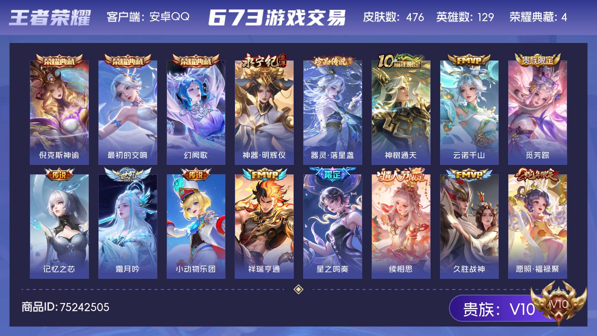 V10 皮肤476 英雄129 至尊星耀 荣耀典藏4 无双皮肤1 珍品传说1 传说43 其他皮肤433