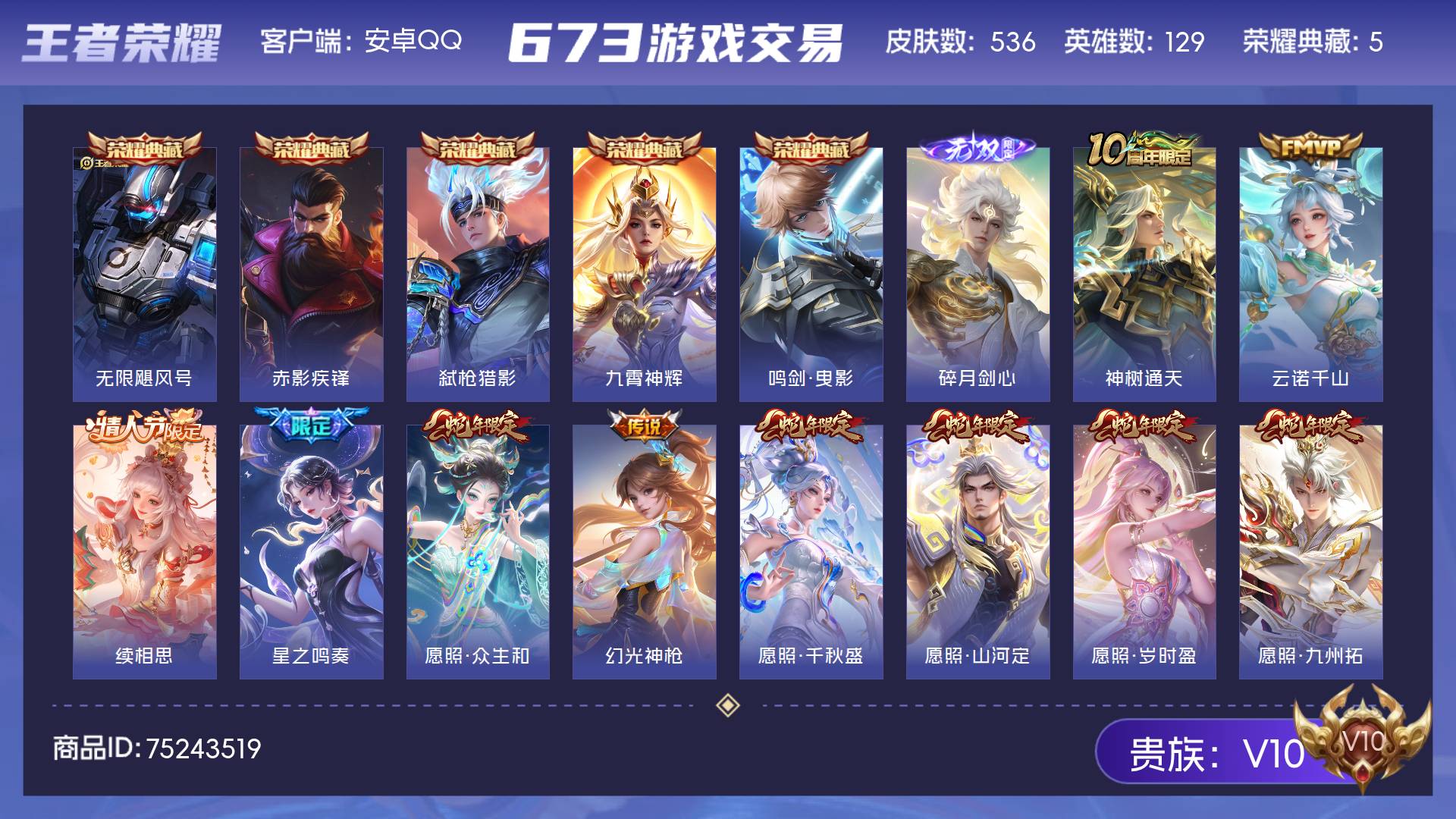 V10 皮肤536 英雄129 至尊星耀 荣耀典藏5 无双皮肤1 传说70 其他皮肤464