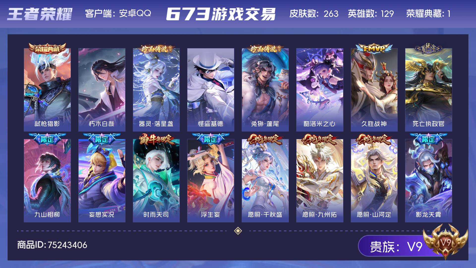 V9 皮肤263 英雄129 至尊星耀 荣耀典藏1 珍品传说5 传说30 其他皮肤231