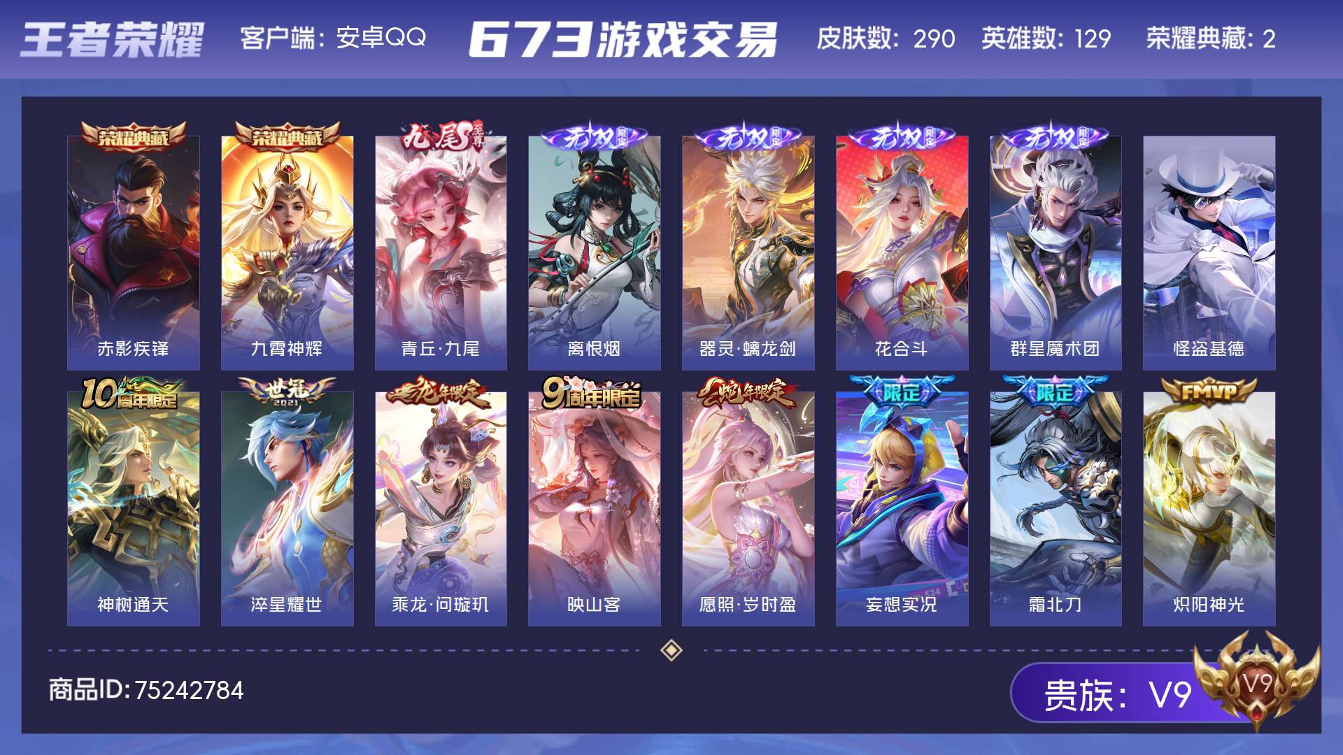 V9 皮肤290 英雄129 永恒钻石 荣耀典藏2 无双皮肤5 珍品传说1 传说41 其他皮肤247