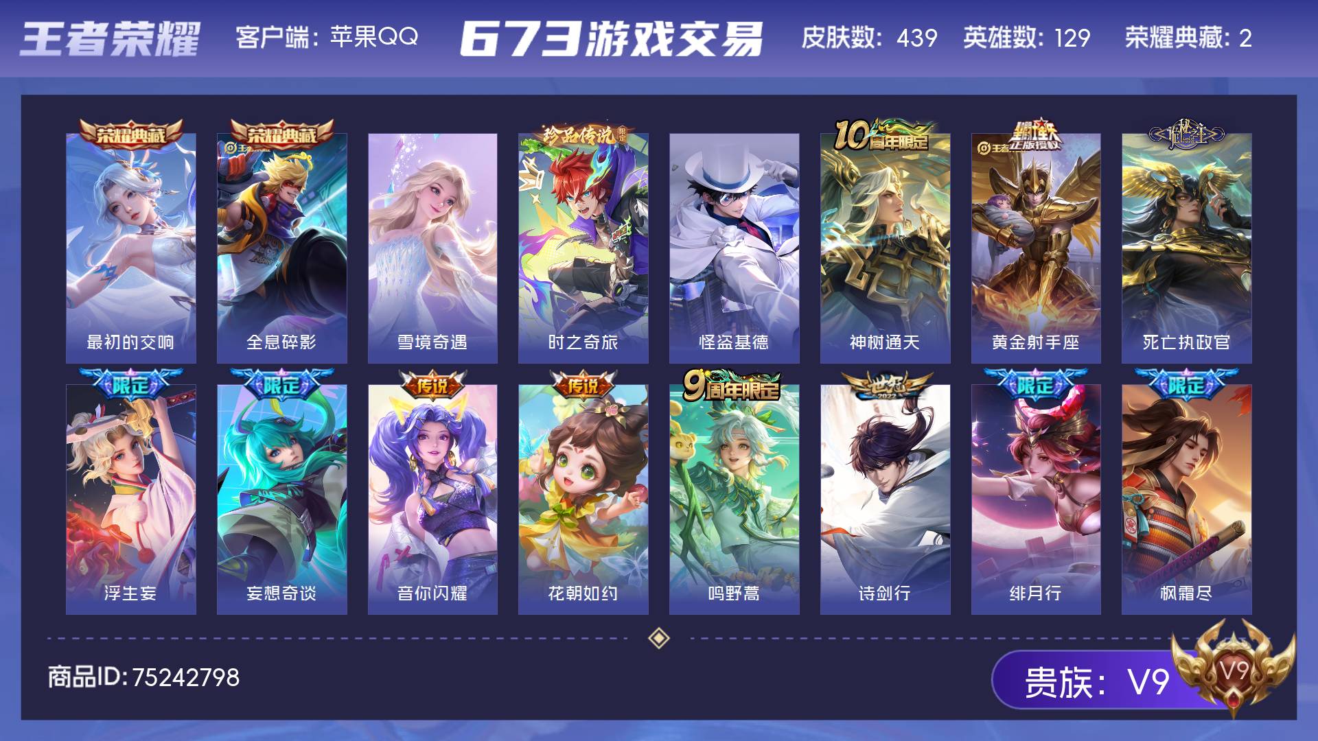V9 皮肤439 英雄129 最强王者 荣耀典藏2 无双皮肤1 珍品传说2 传说30 其他皮肤408