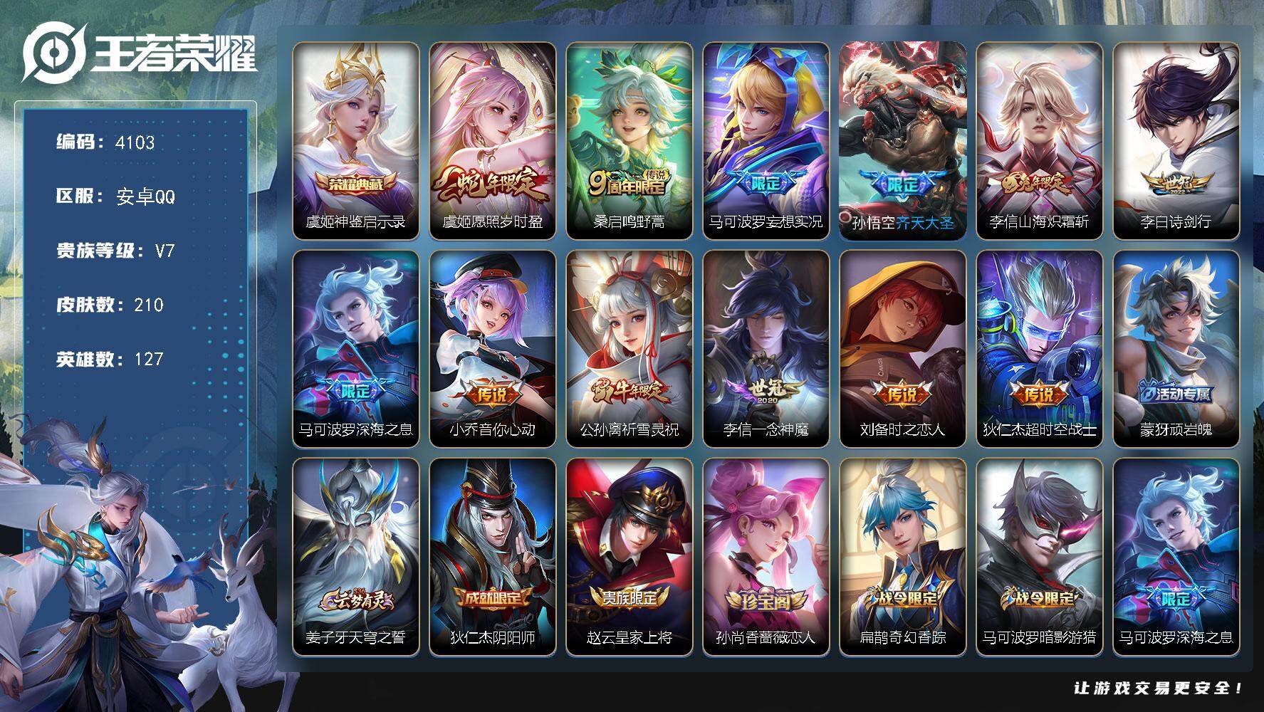 安卓Q-V7-至尊星耀III段位-127英雄-210皮肤-1典藏皮肤-12传说