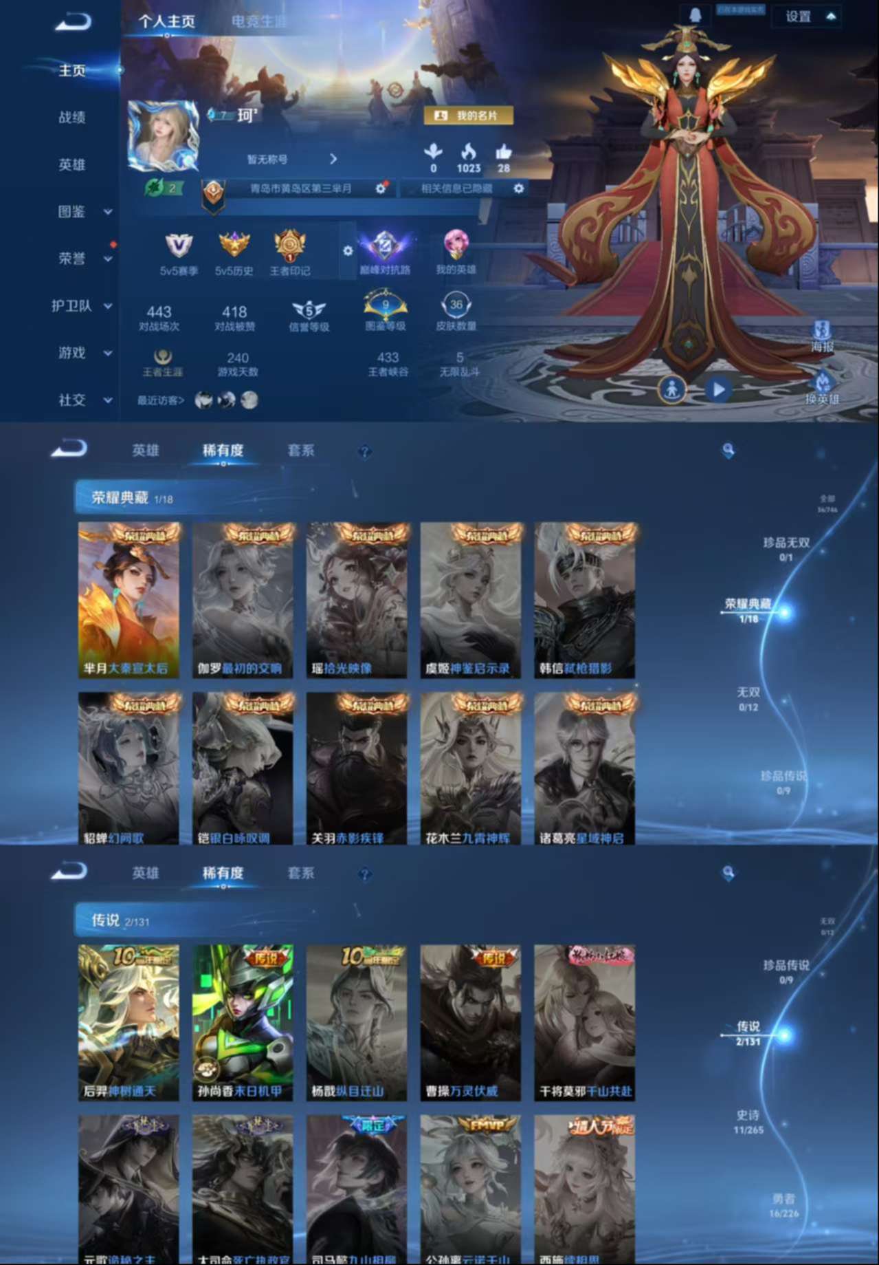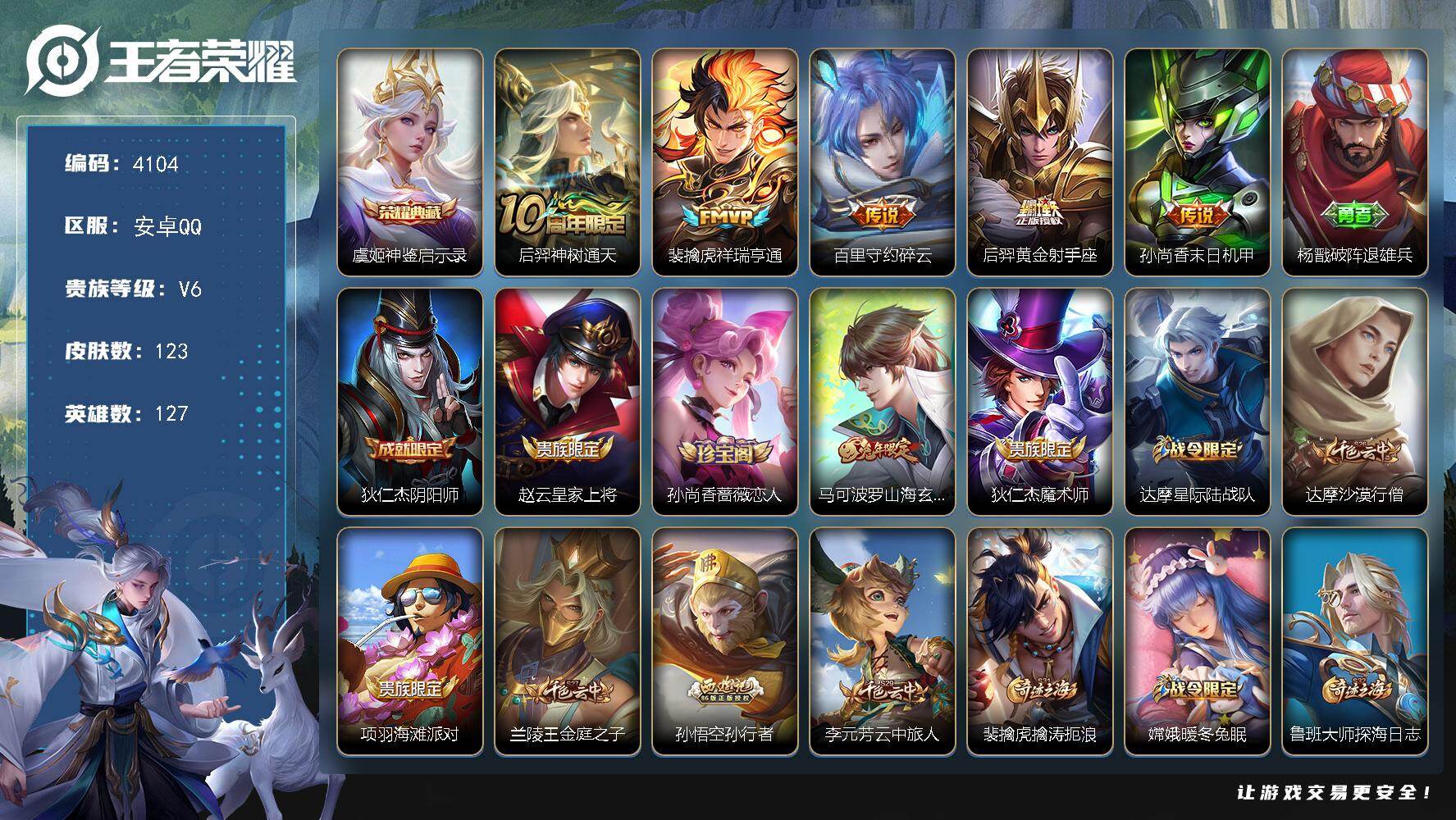 安卓Q-V6-至尊星耀II段位-127英雄-123皮肤-1典藏皮肤-5传说-3