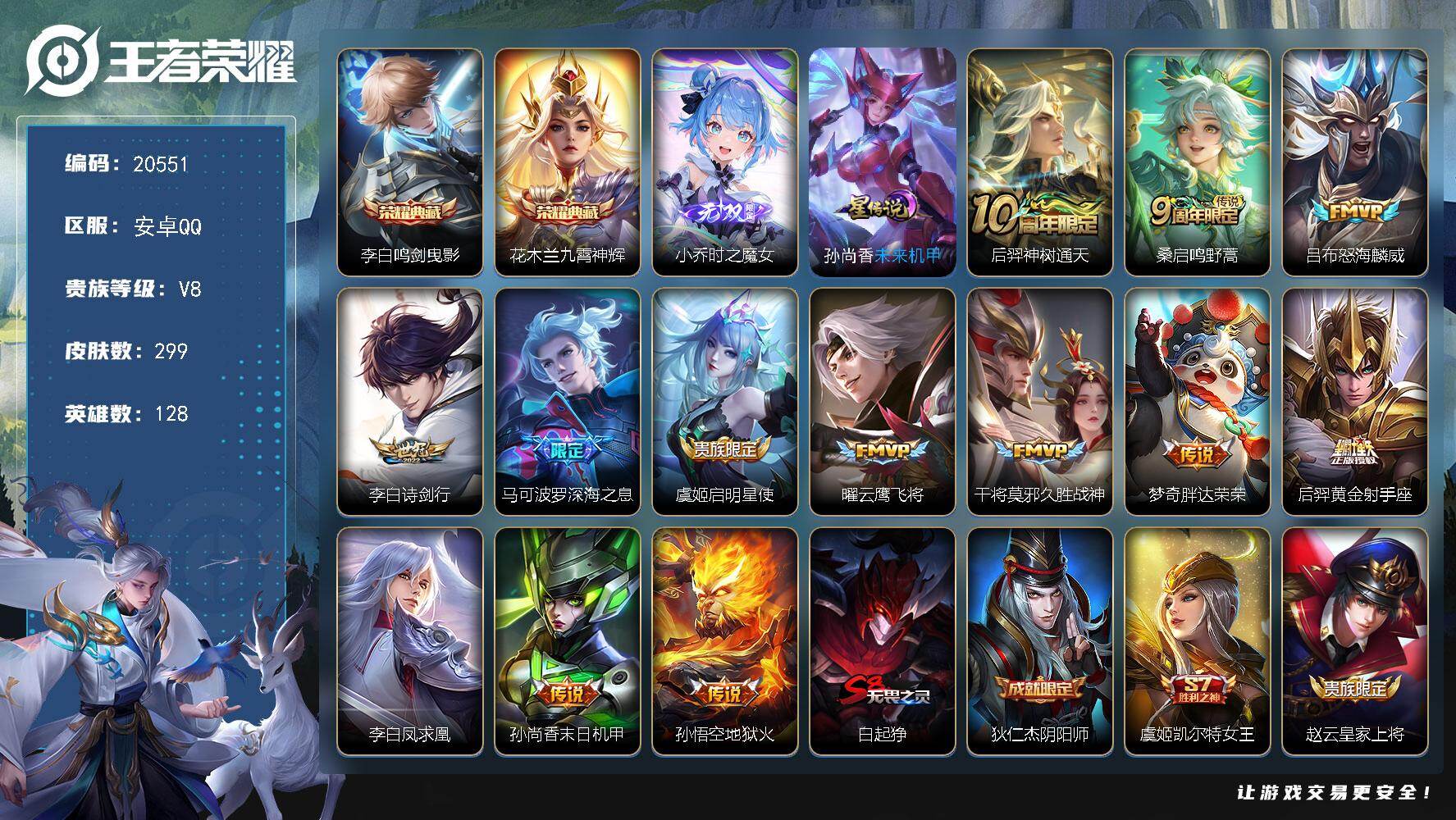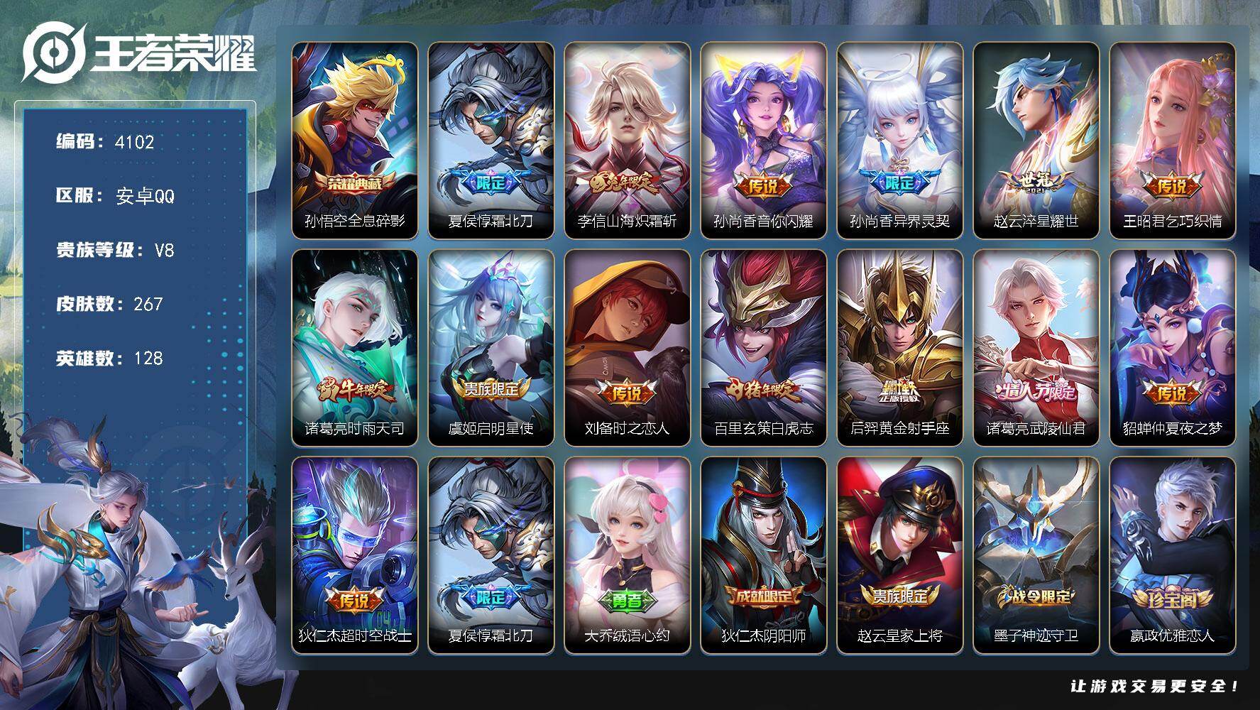 安卓Q-V8-尊贵铂金I段位-128英雄-267皮肤-1典藏皮肤-14传说-8