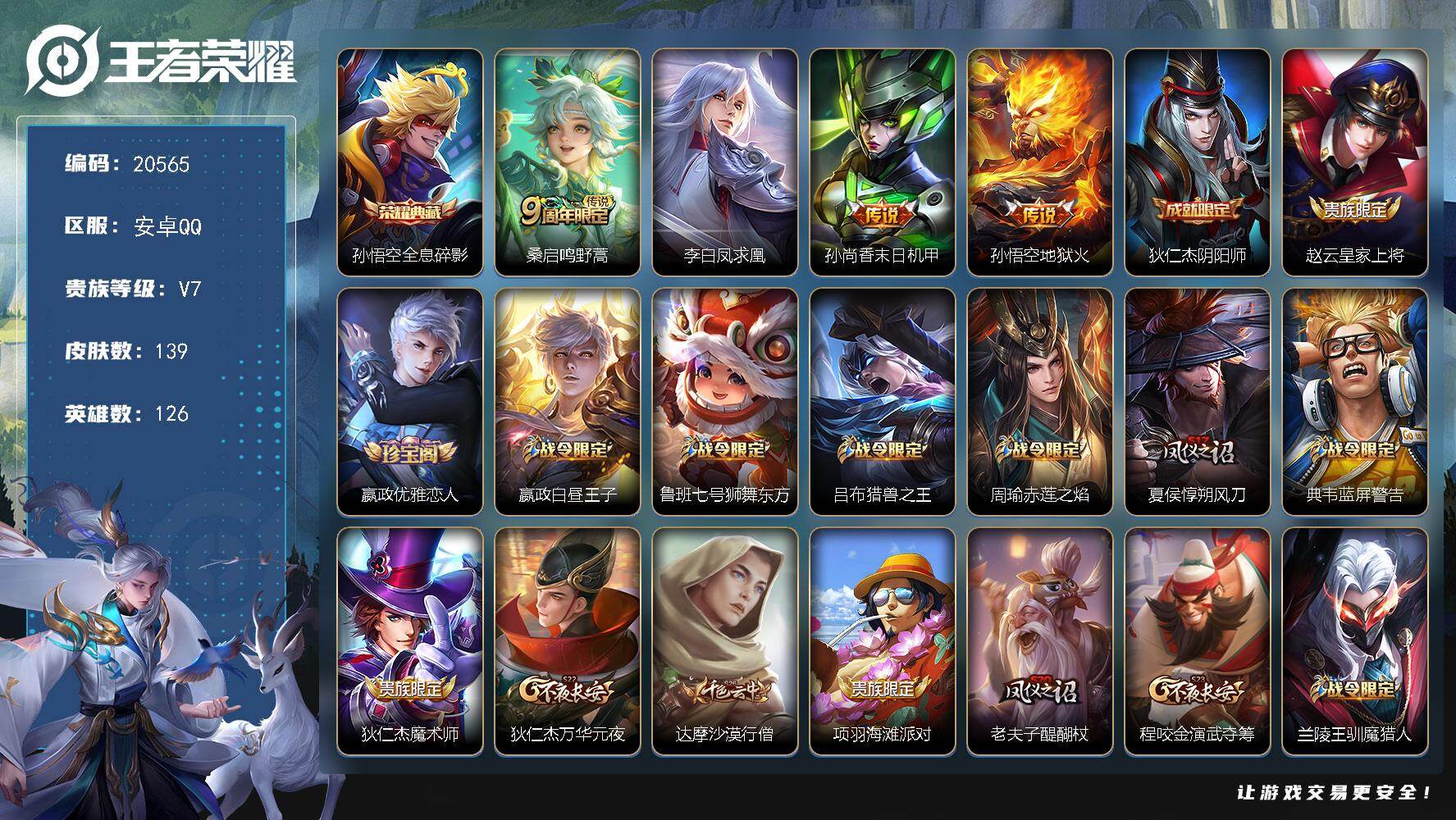 实名: 可修改 贵族等级: V7 英雄数: 126 皮肤数: 165 荣耀水晶